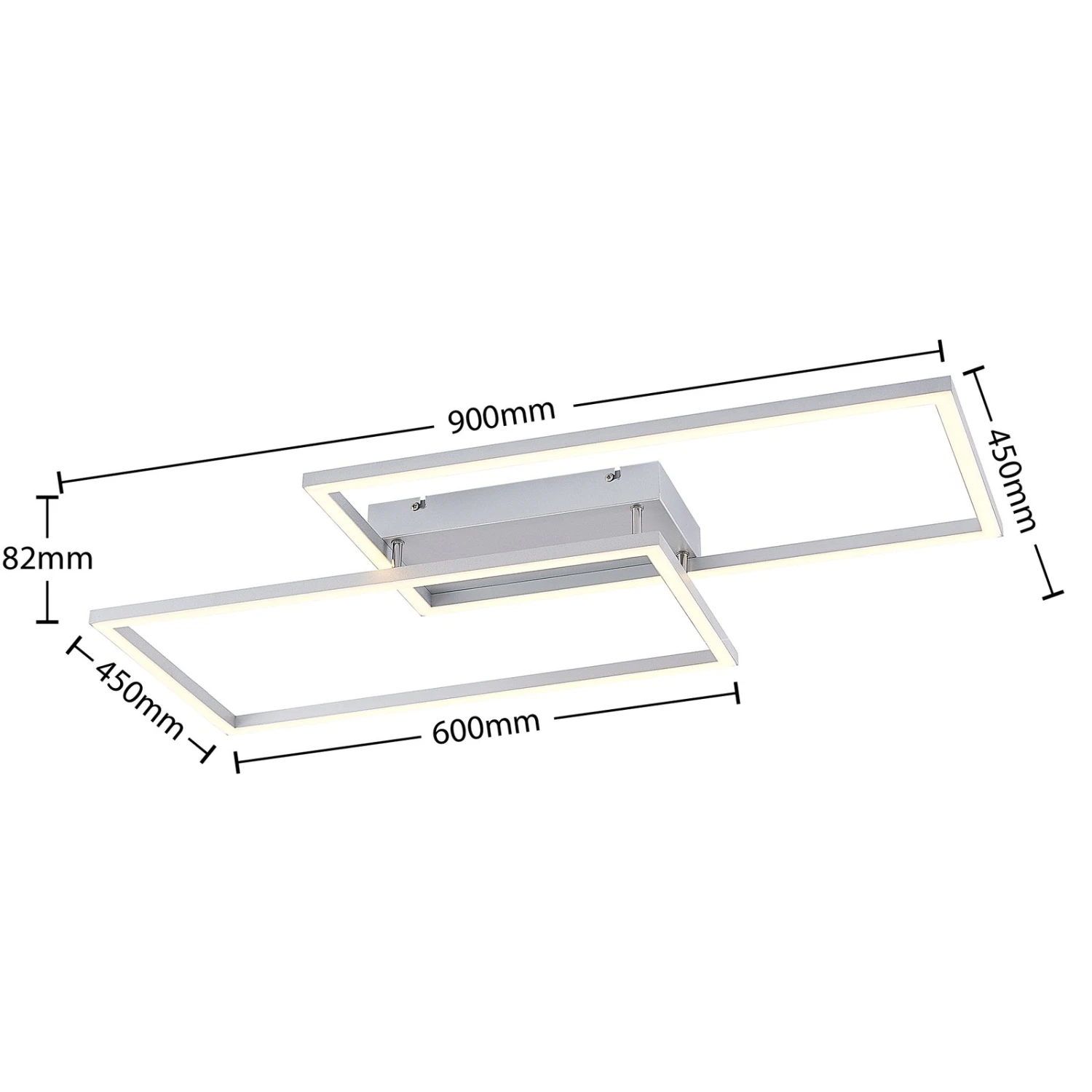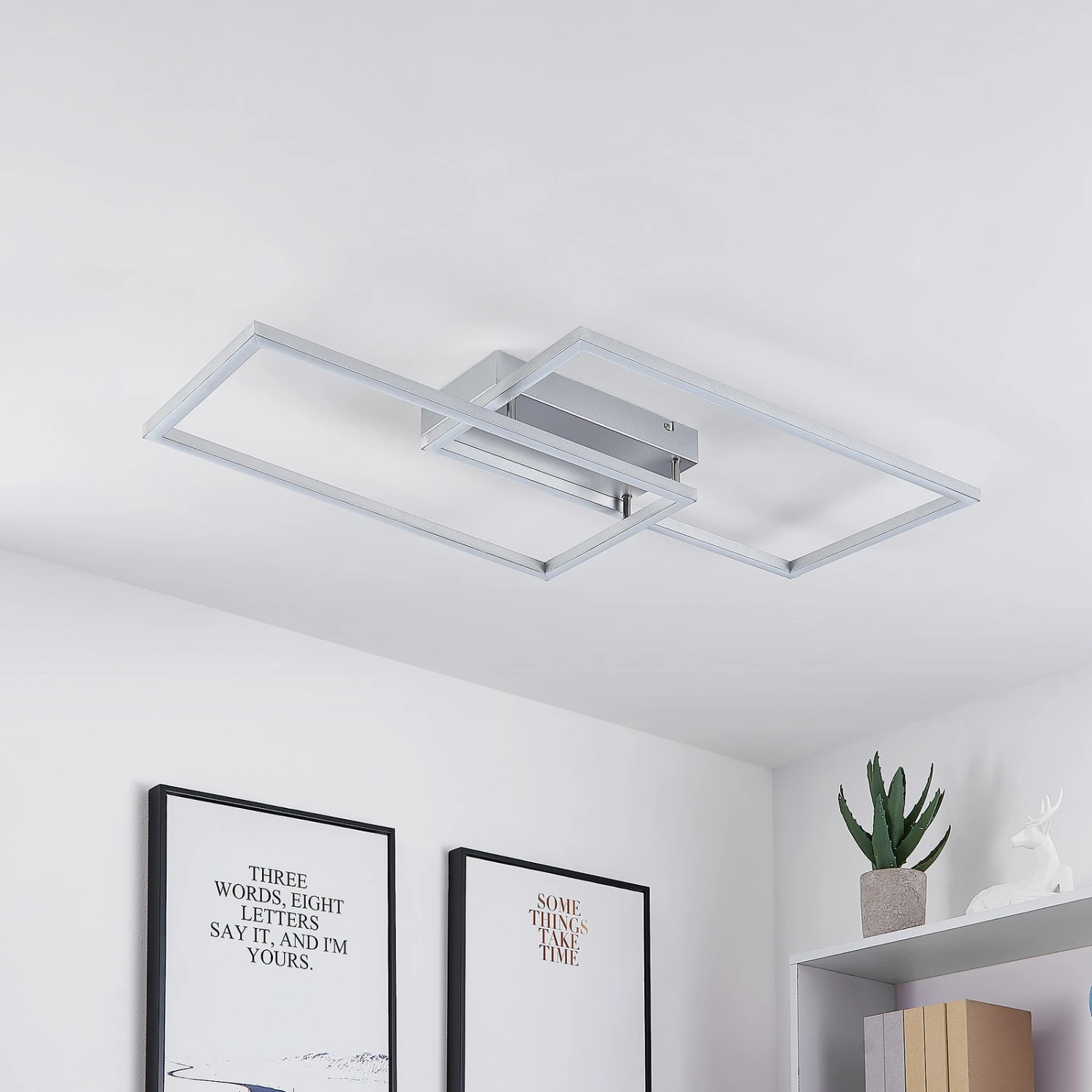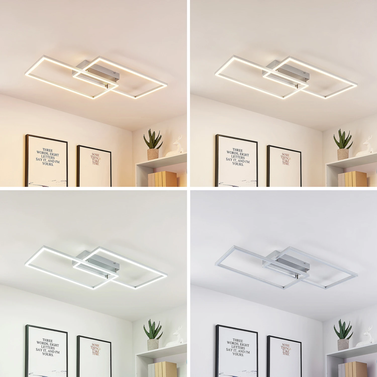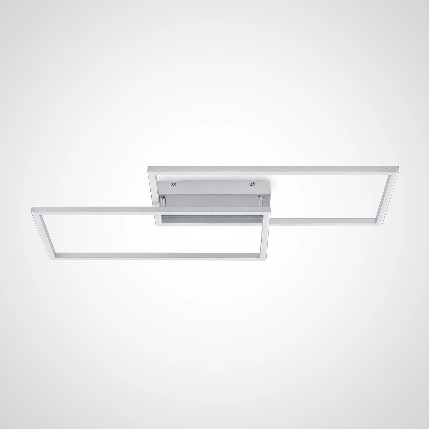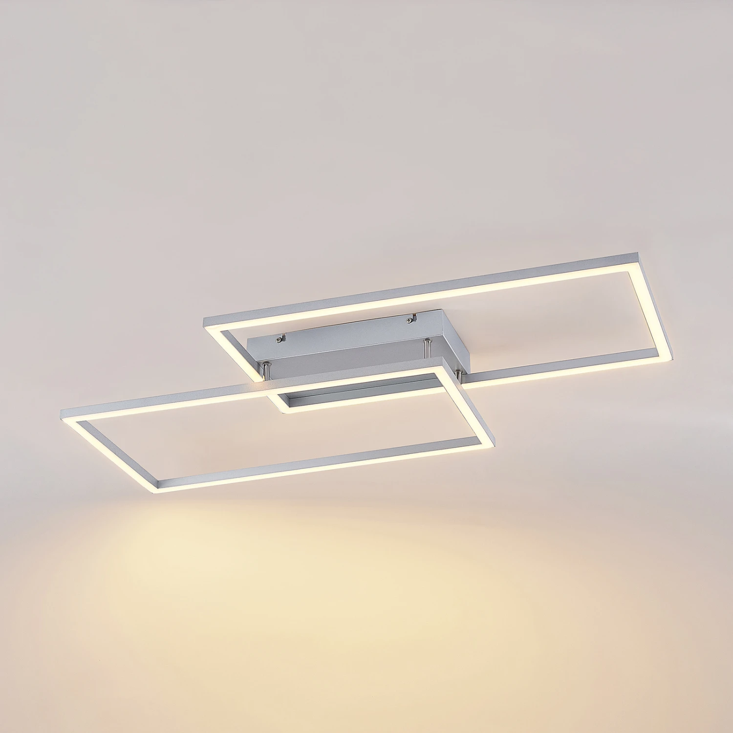 Die LED-Deckenlampe Muir besitzt ein attraktives, symmetrisches Design und kommt darüber hinaus mit weiteren zweckmäßigen Funktionalitäten. Ihr Leuchtenkörper wurde aus Aluminium und Eisen hergestellt und besteht aus zwei rechteckigen Rahmen, die sich an einer Ecke überkreuzen und somit ein pfiffiges Muster erzeugen. Innerhalb dieser Rahmen verlaufen fest verbaute LEDs, welche mit Hilfe einer Fernbedienung oder eines Wandschalters steuerbar sind.