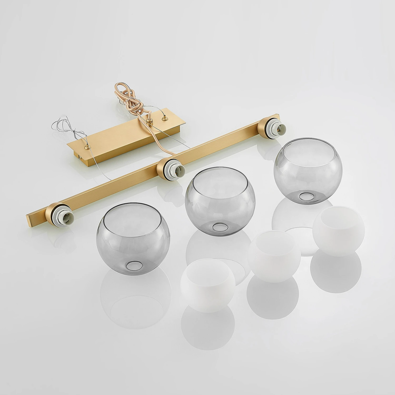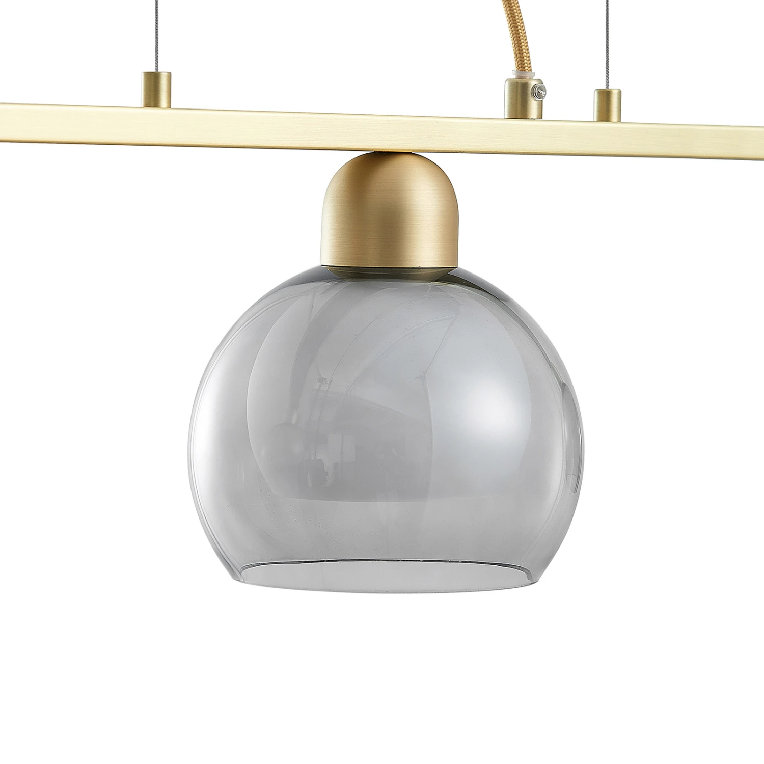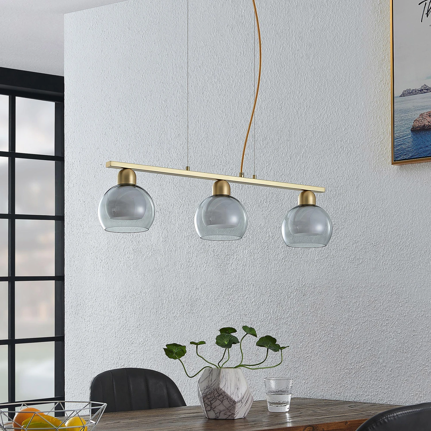 Die Hängelampe Mylah eignet sich hervorragend für die Installation in einem Esszimmer oder einem Wohnzimmer. Das längliche Design ist perfekt für die Beleuchtung eines Esstisches und sorgt für die nötige Helligkeit während des Essens. Sie besteht aus einer Strebe, die horizontal an einer Aufhängung angebracht ist und drei Leuchtenschirme trägt. Diese Schirme bestehen jeweils aus weißem und rauchgrauem Glas und können mit entsprechenden Leuchtmitteln bestückt werden. Die Wahl nach dem Leuchtmittel ermöglicht es, die Lichtintensität und Lichtfarbe an die persönlichen Bedürfnisse anzupassen. Das markante Vintage-Design der Hängeleuchte Mylah setzt auffallenden Akzente im Innenbereich und verleiht jedem Raum das gewisse Etwas.