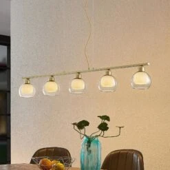 Die Hängelampe Mylah findet ihren perfekten Platz in einem Wohnzimmer oder in einem Esszimmer. Ihr längliches Design ist perfekt für die Installation über einem Esstisch und spendet das nötige Licht für das abendliche Essen. Ihr Leuchtenkörper ist aus Eisen hergestellt und präsentiert ich in einem stimmigen Messing. Sie trägt fünf Leuchtenschirme, die jeweils aus zwei Glasschirmen bestehen und in rauchigen bzw. weißen Farben gehalten sind. Diese Schirme können mit entsprechenden Leuchtmitteln bestückt werden und ermöglichen eine freie Wahl nach Lichtintensität und Lichtfarbe. Somit kann die Beleuchtung an die persönlichen Bedürfnisse angepasst werden.