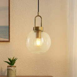 Die Hängeleuchte Nalian wurde aus Eisen und Glas hergestellt, was einen ganz besonderen Materialmix zu einer harmonischen Einheit zusammenbringt. Die runde Deckenhalterung sowie die Abhängung sind eher dezent gestaltet, wobei der kugelförmige Leuchtenschirm aus Glas im Vordergrund steht. Das messingfarbene Oberflächenfinish verleiht der Leuchte einen wertigen Charakter. Dieser sollte durch die Wahl des richtigen Leuchtmittels hervorgehoben werden, denn die Brennstelle ist von allen Seiten gut sichtbar. Nalian macht einen schönen Eindruck über einem Esszimmertisch oder über einer Theke und kann auch im Bereich des Gewerbes eine gute Figur machen.