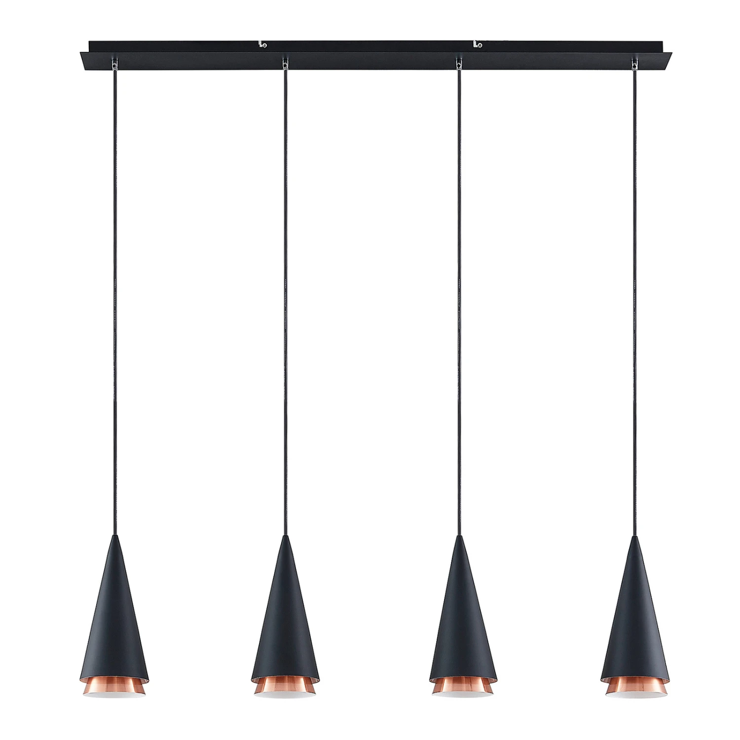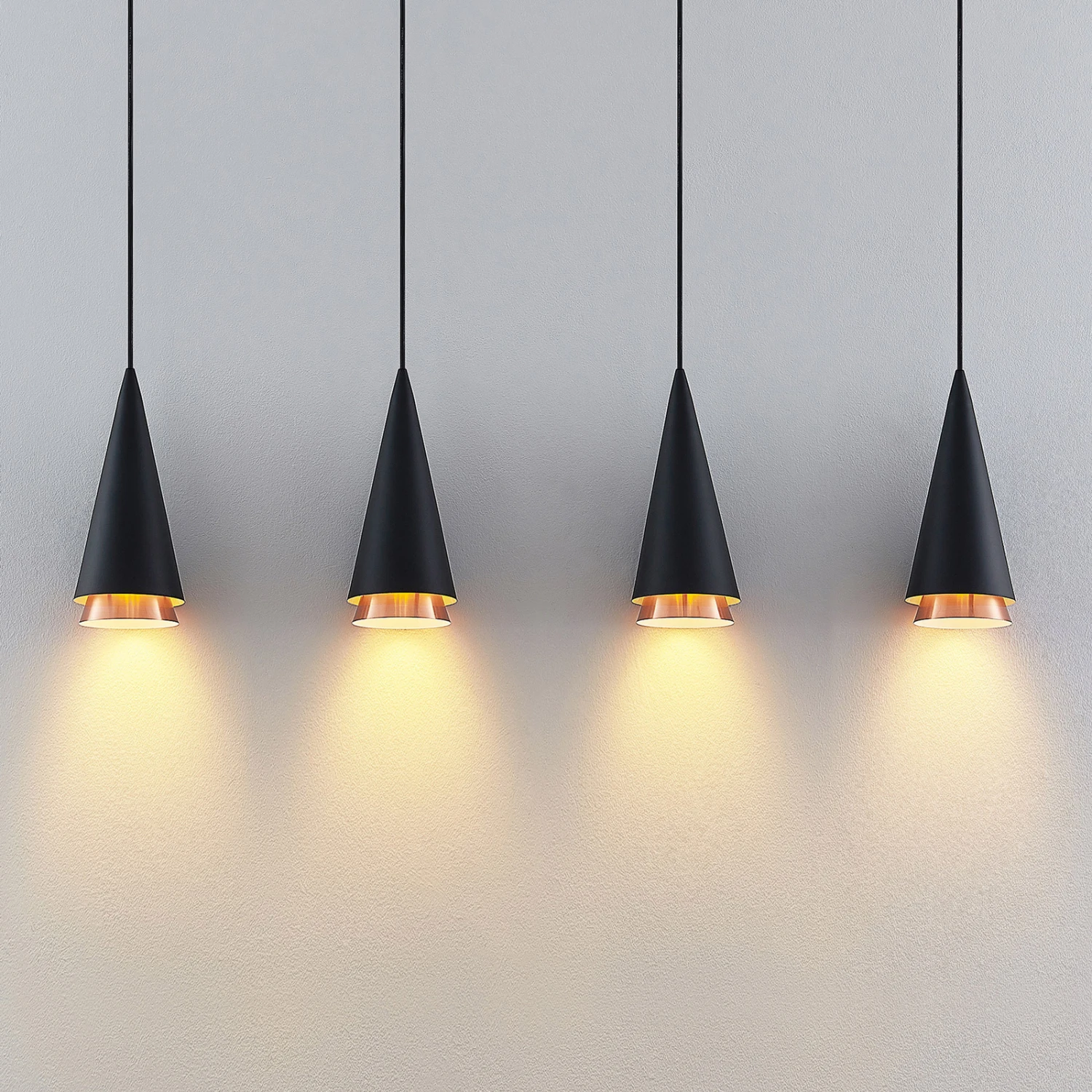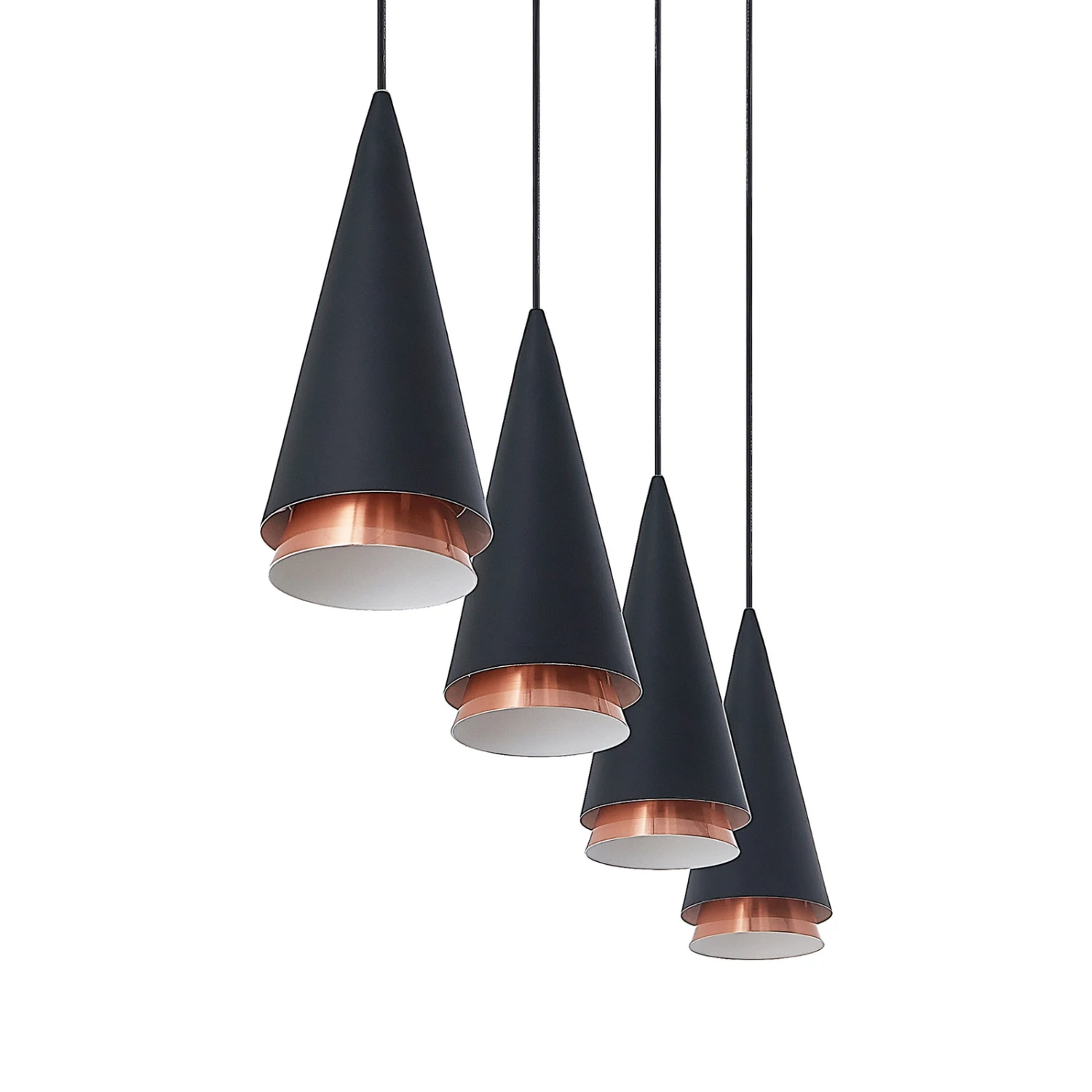 Vierflammige Pendelleuchte Naoh mit kegelförmigen Schirmen in Schwarz mit Kupferdetails