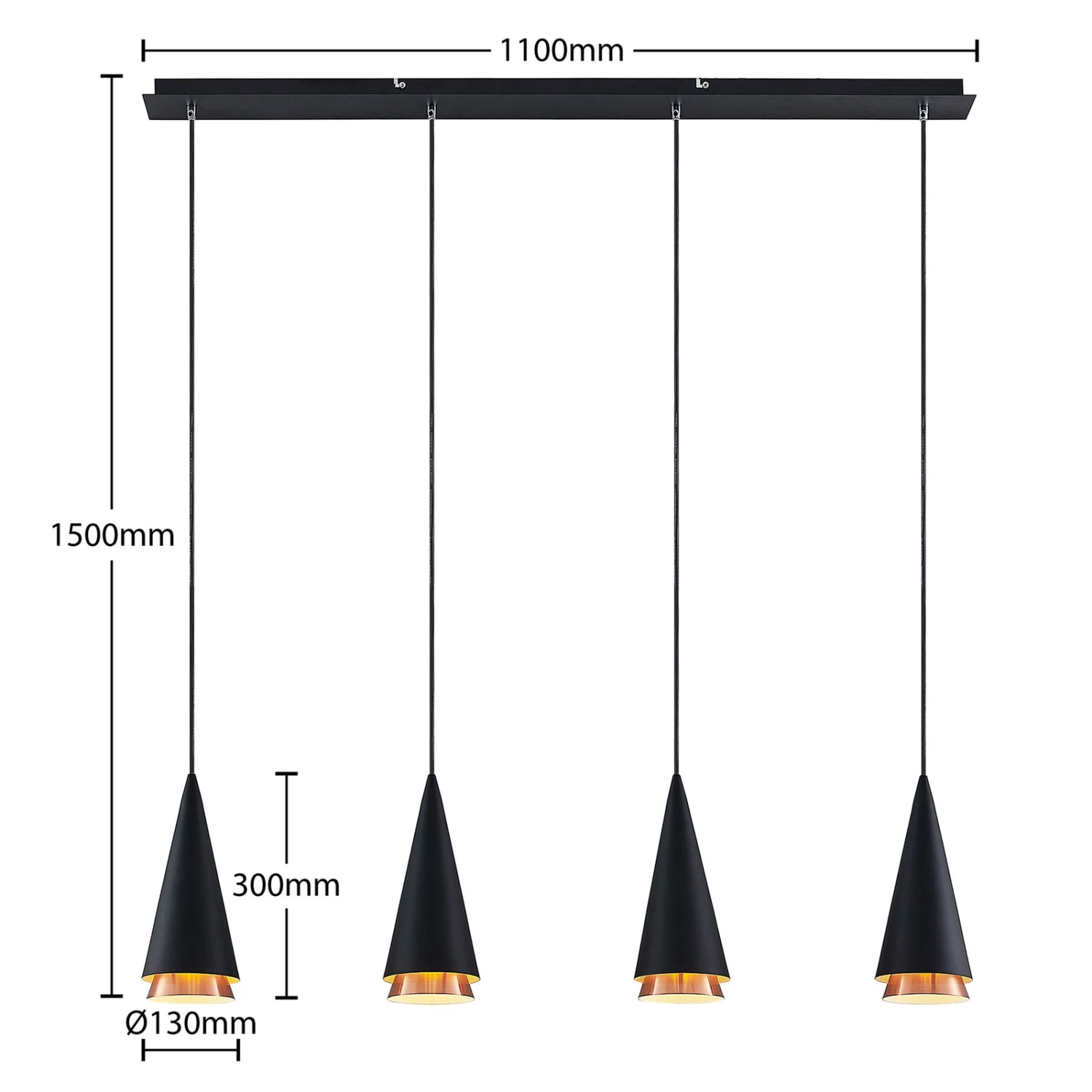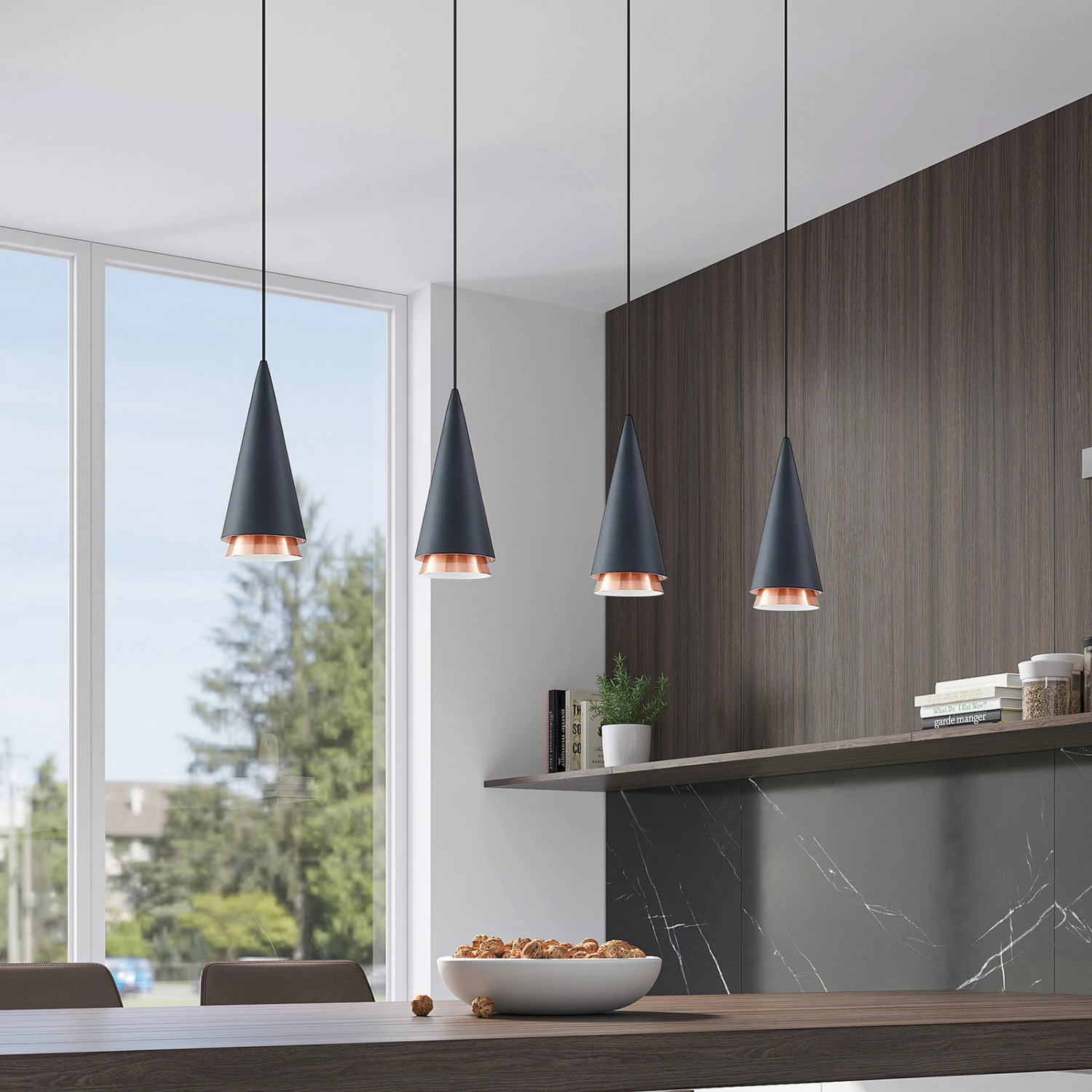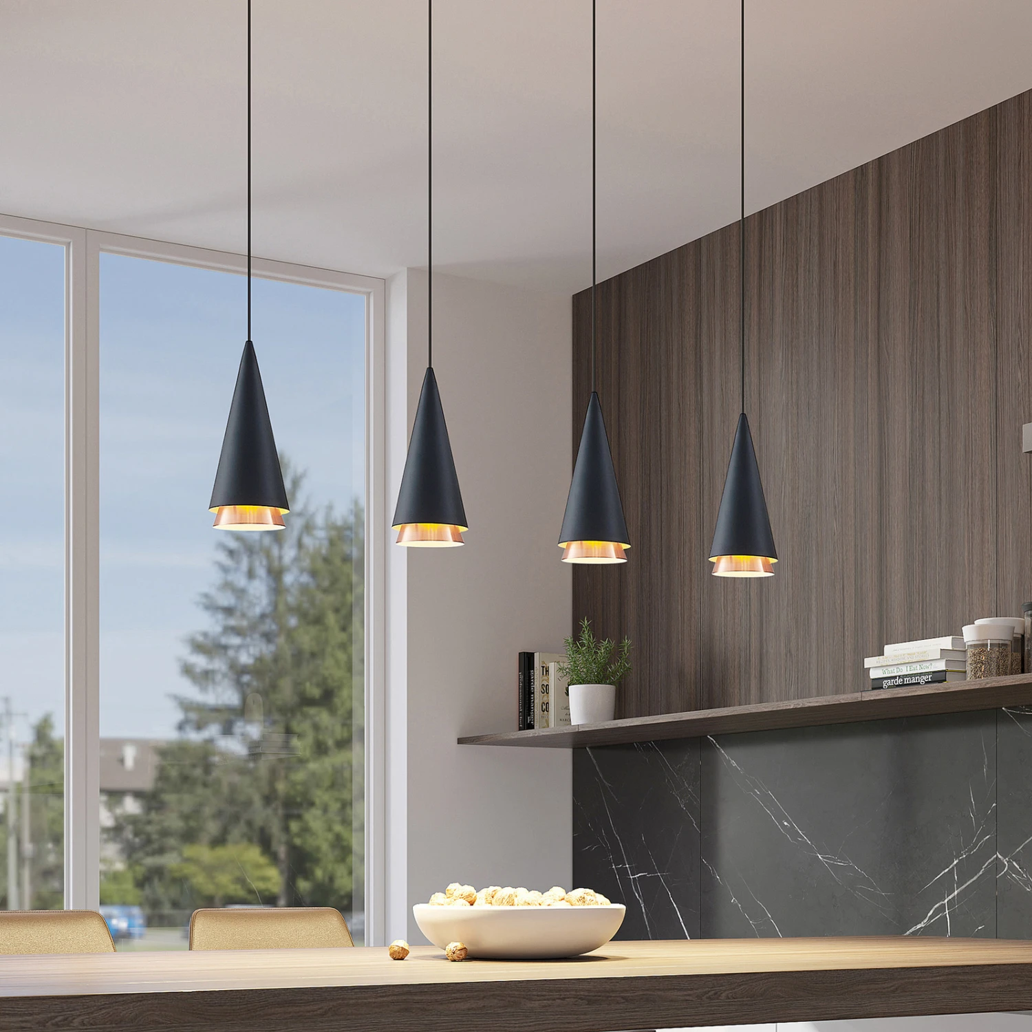Vierflammige Pendelleuchte Naoh mit kegelförmigen Schirmen in Schwarz mit Kupferdetails