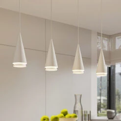 Naoh überzeugt im wahrsten Sinne des Worte auf ganzer Linie, denn die Pendelleuchte ist in länglicher, linienförmiger Form gestaltet und passt damit hervorragend über einen Tisch, wo sie als Essplatzbeleuchtung dienen kann. Wegen der Metallschirme wird der Lichtschein ausschließlich nach unten abgegeben und illuminiert die Fläche hell und gebündelt, während die Raumbeleuchtung durch Blendfreiheit gekennzeichnet ist. Die Kegel wirken stilvoll und sind besonders individuell gestaltet, weil sie eine zweilagige Form besitzen.