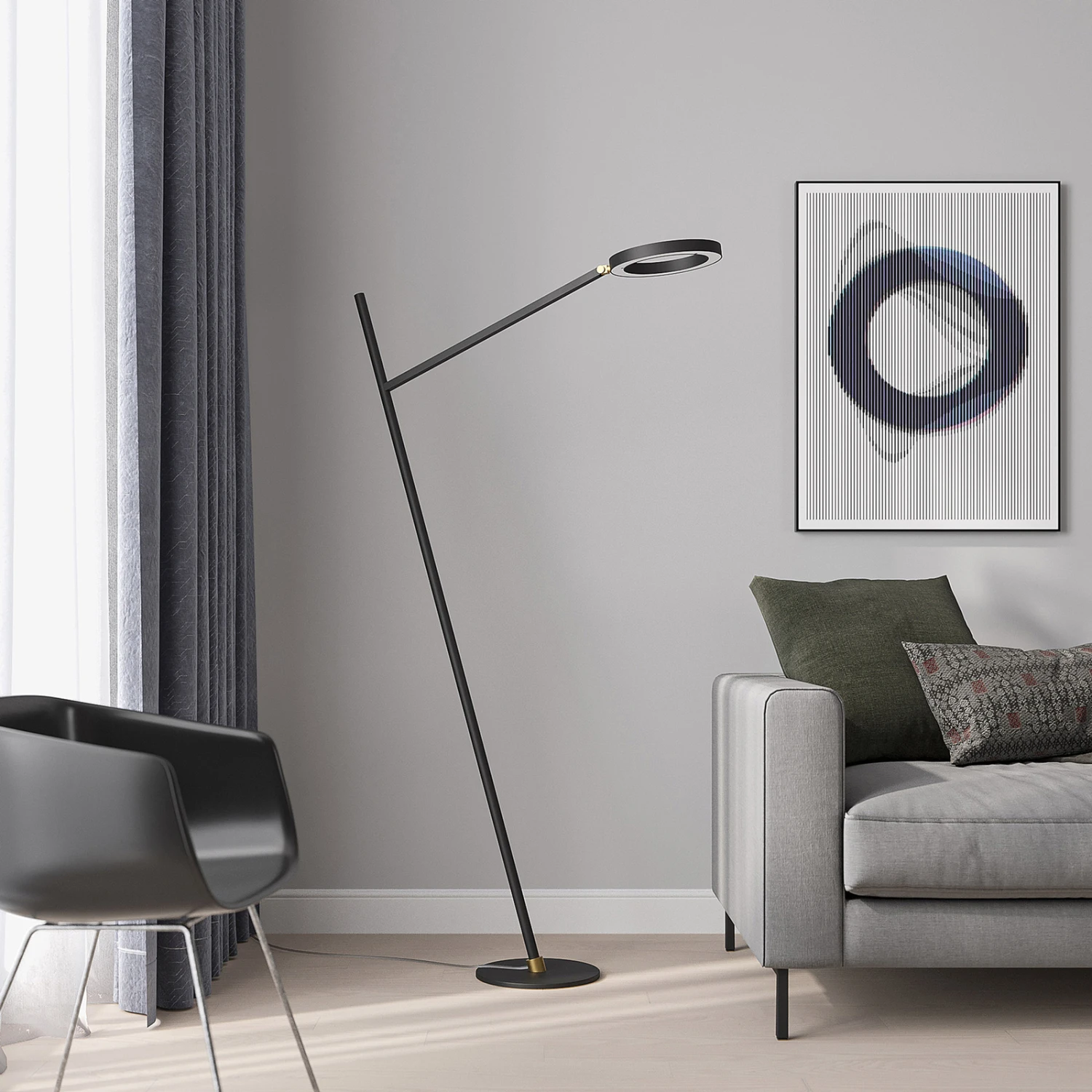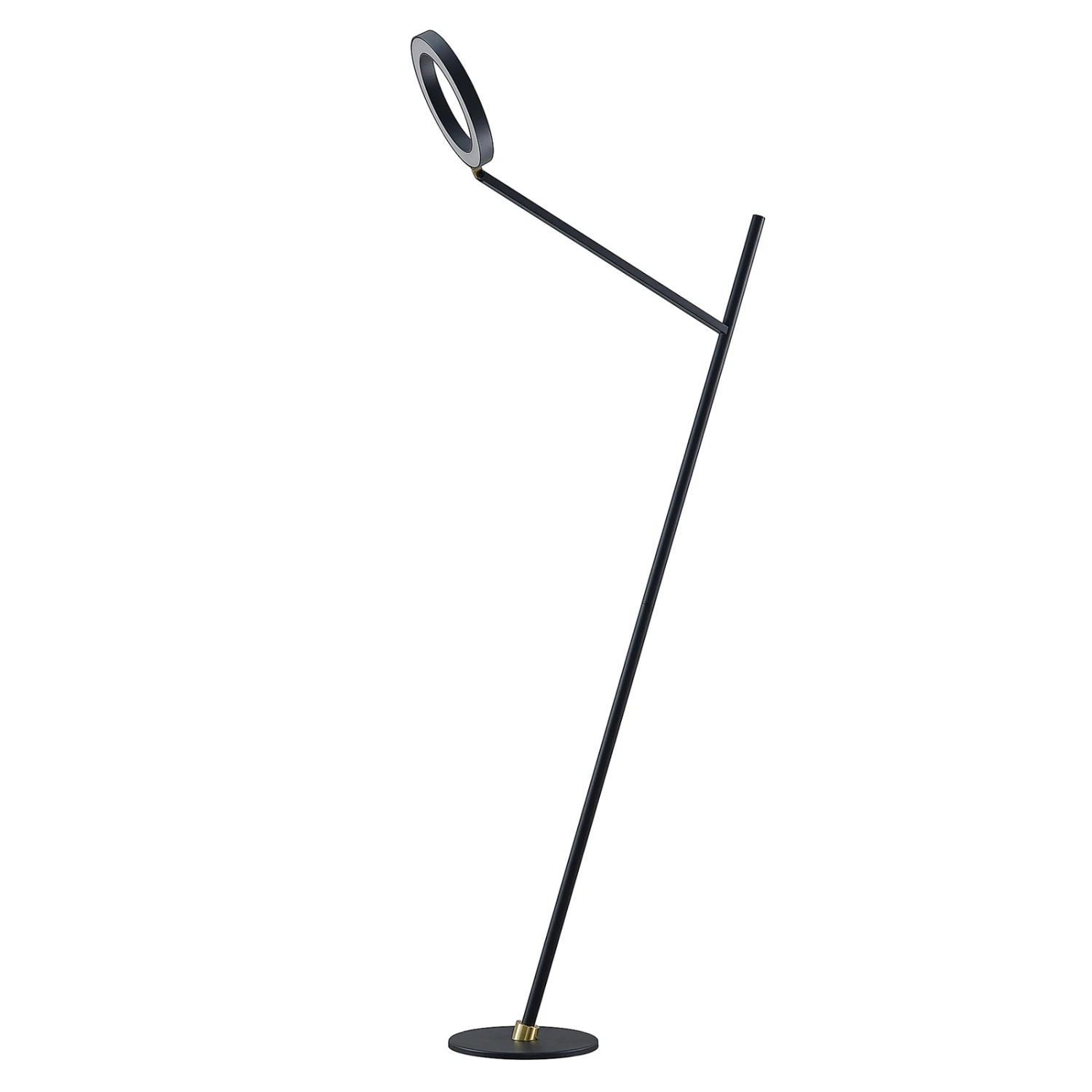 Die Gestaltung dieser LED-Stehlampe ist höchst modern und vor allem minimalistisch. Das bedeutet, dass sie sich mit allen zeitgemäßen und detailreduzierten Wohnstilen richtig gut kombinieren lässt. Der flache Lampenfuß ist rund und schwarz, während zwei schräg zueinander angeordnete Stäbe das Gestell bilden und das Konstrukt oben schließlich in einem ringförmigen Schirm endet, der geschwenkt werden kann. Dieser ist mit effizienten LEDs bestückt und leuchtet hell. Bei Bedarf kann aber ein integrierter Touchdimmer für die Regulation der Helligkeit genutzt werden. Die Metalloberfläche ist fast durchgängig schwarz, lediglich das Gelenk am Schirm und einer kleiner Ring am Fuß sind goldfarben getönt und sorgen für einen dezenten, aber sehenswerten Kontrast.