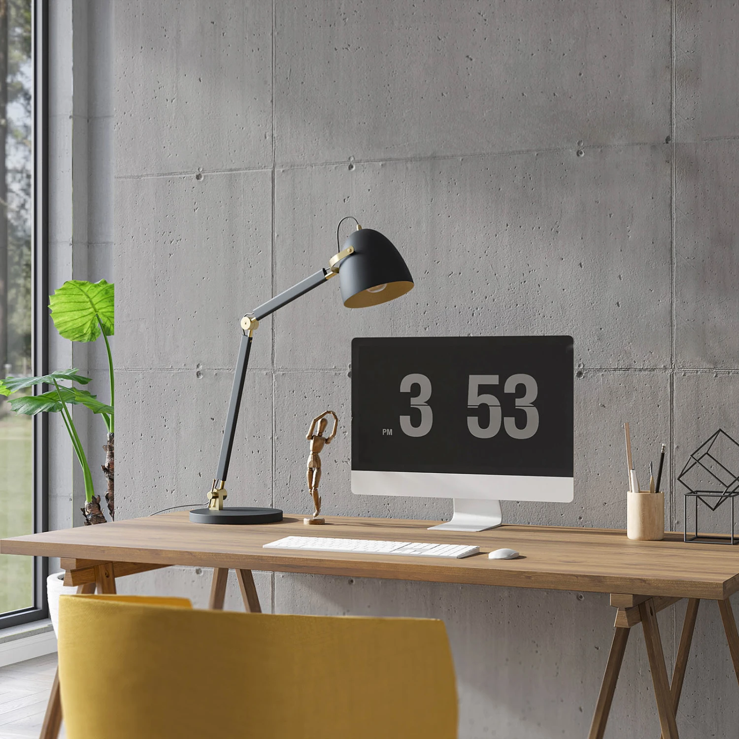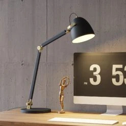 Nordin eignet sich hervorragend für den heimischen Schreibtisch und ist ein Lichtspender, der wunderbar beim Arbeiten unterstützen kann. Die Tischleuchte setzt sich aus mehreren Metallelementen zusammen und ist dank der Gelenke nicht starr, sondern kann in ihrer Ausrichtung verändert werden. Schirm, Fuß und die beiden Stangen sind schwarz, während die Schirminnenseite und die Übergänge mit den Gelenken golden gefärbt sind. Auf diese Weise entsteht ein schöner, stilvoller Kontrast, der das Erscheinungsbild auflockert und für warme Lichteflexionen sorgt. Die Höhe kann durch die Gelenke von 59 cm bis 100 cm angepasst werden und Filamentlampen sorgen für eine passende Optik im Schirm, weil sie Glühlampen ähneln, und sind deshalb eine gute Empfehlung für die Leuchtmittelwahl.