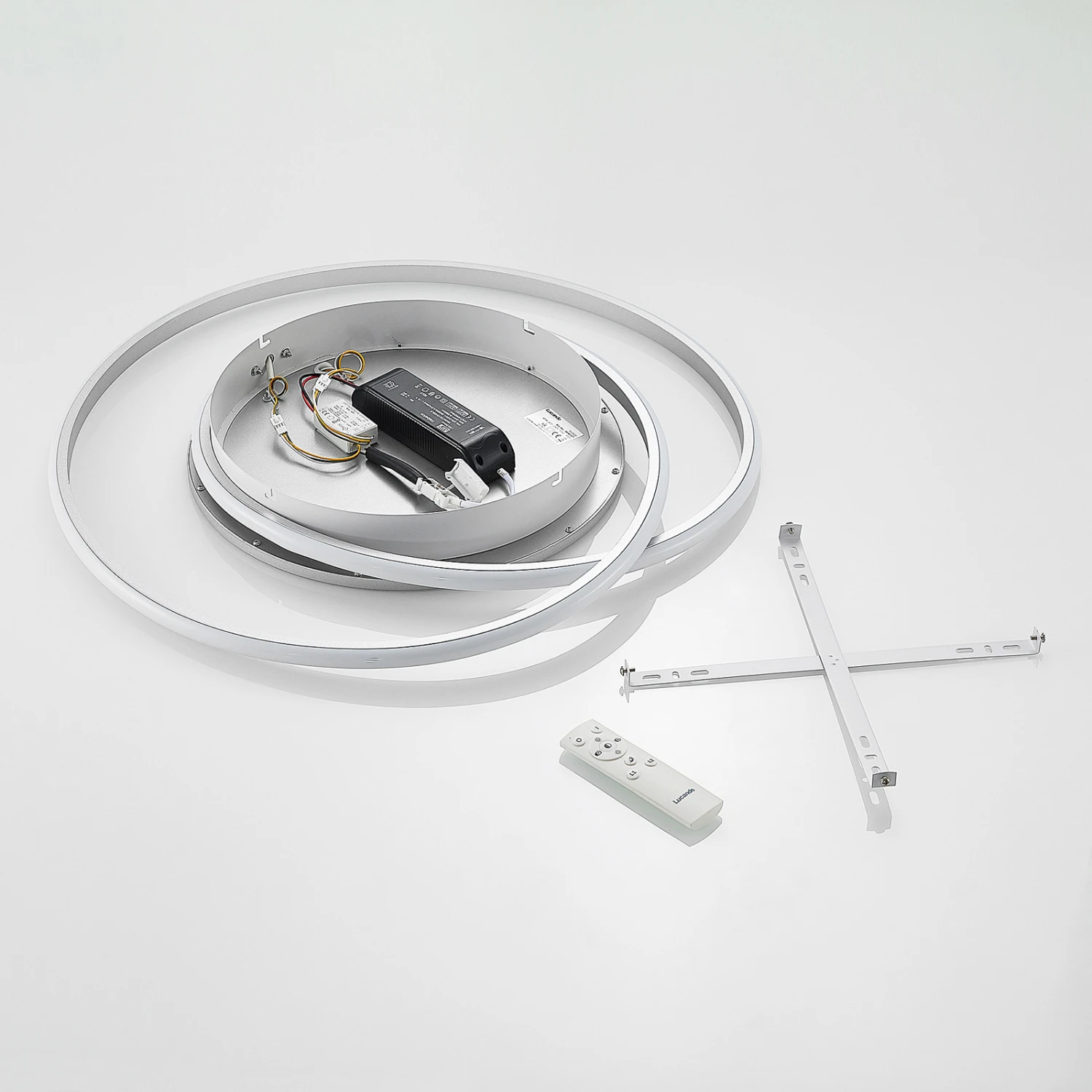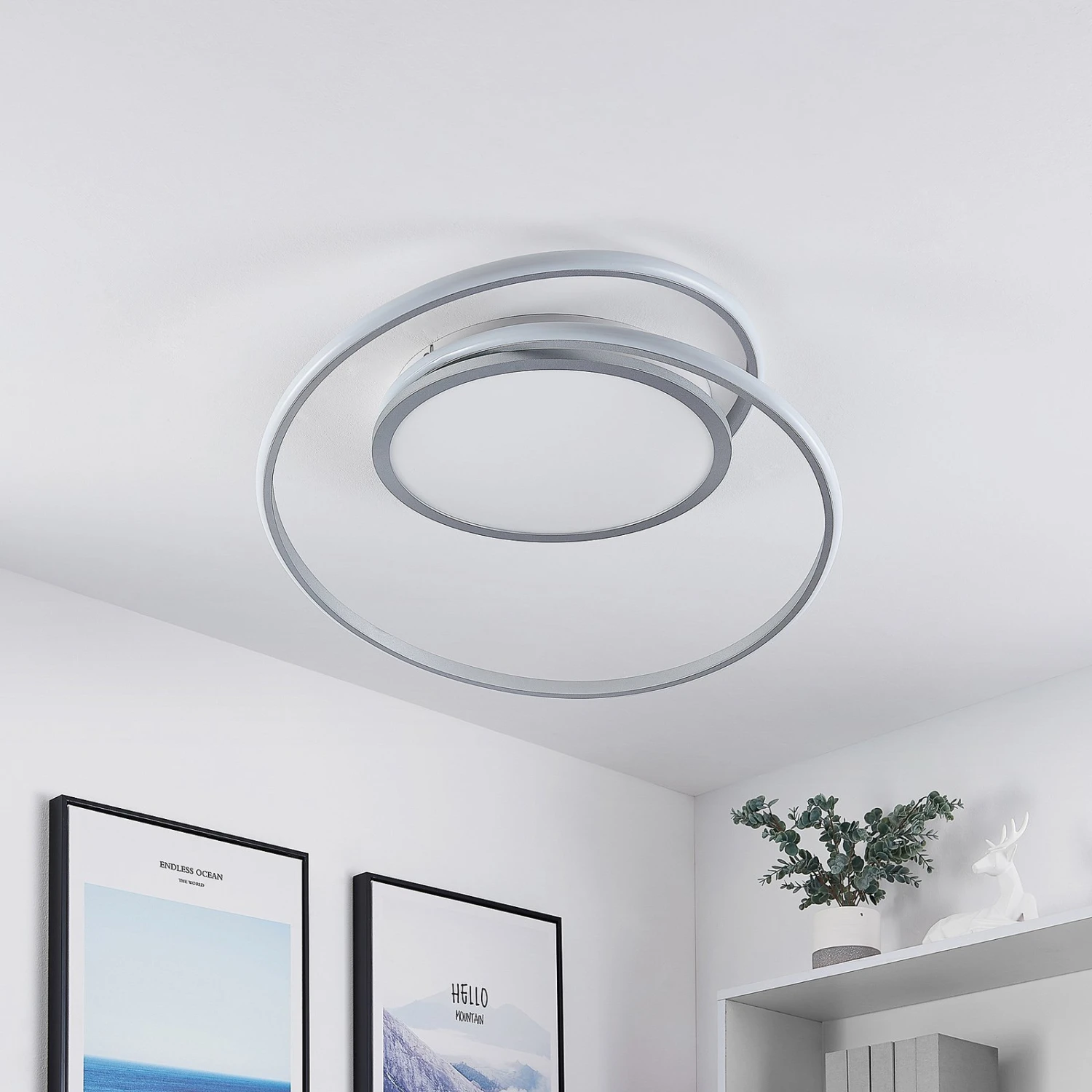 Die LED-Deckenlampe Noud überzeugt mit ihrem modernen Aussehen und ihren zweckmäßigen Eigenschaften. Sie besteht aus silbernem Eisen und Aluminium und setzt sich aus einem kreisförmigen Element und einer schlanken Strebe, welche sich schwungvoll um dieses bewegt, zusammen. Im Inneren sitzen festverbaute LEDs, welche mit einer Fernbedienung hinsichtlich ihrer Helligkeit (10 % – 100 %) stufenlos gedimmt werden können und in ihrer Lichtfarbe gesteuert werden können (2.700 K, 4.000 K und 6.500 K). Dies macht aus der LED-Deckenleuchte Noud nicht nur einen attraktiven Dekorationsgegenstand, sondern ein nützliches und flexibles Objekt, wenn es um die Beleuchtung von Innenräumen geht. Ihr elegantes Design sieht vor allem in einem Schlafzimmer oder in einem Wohnzimmer besonders gut aus und setzt stilvolle Akzente an der Decke. Noud lässt sich mühelos in moderne Einrichtungsstile integrieren, ohne dabei die restliche Dekoration in den Schatten zu stellen.