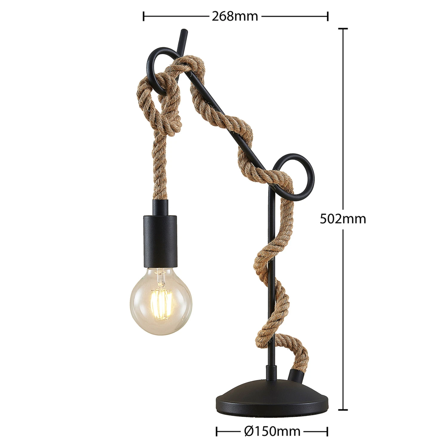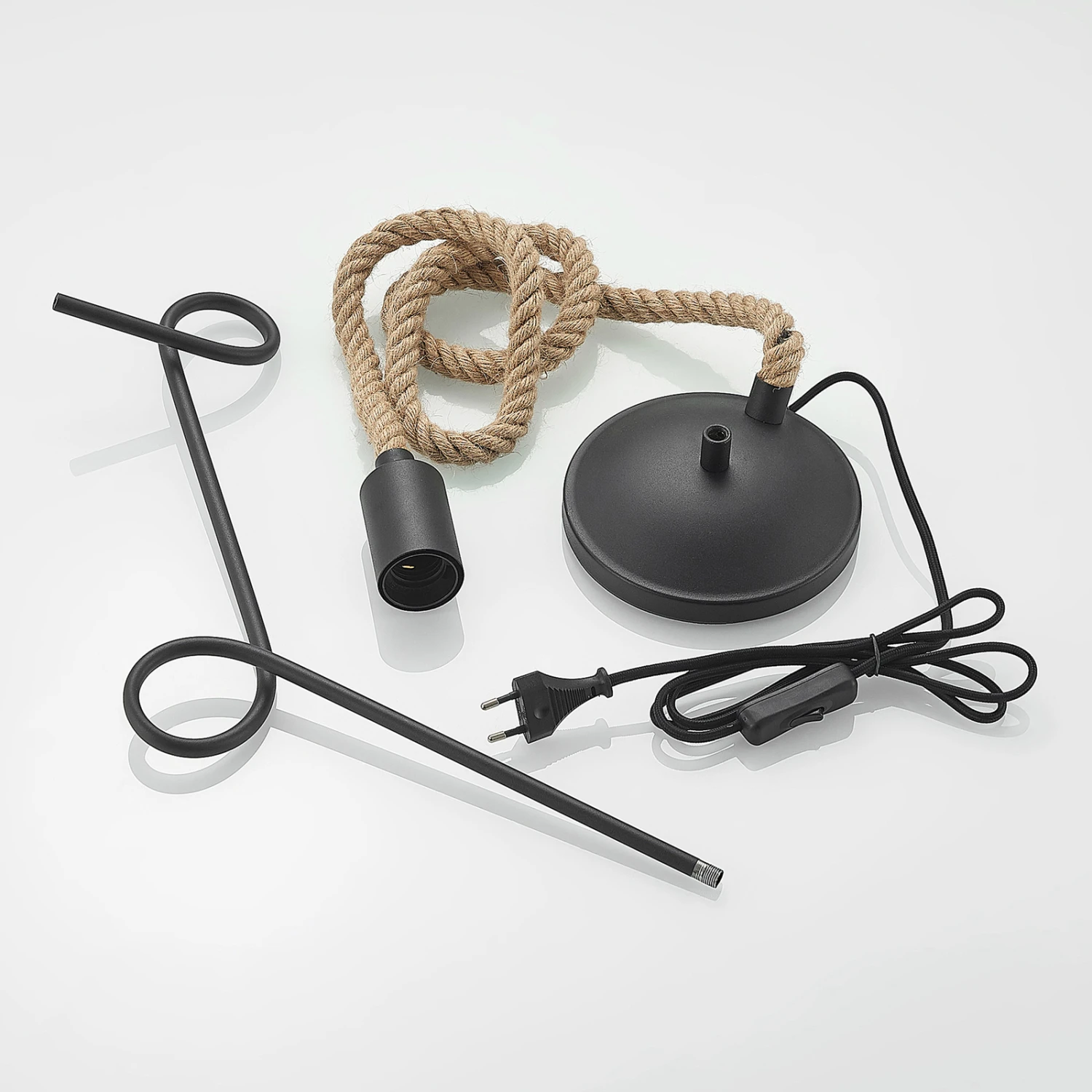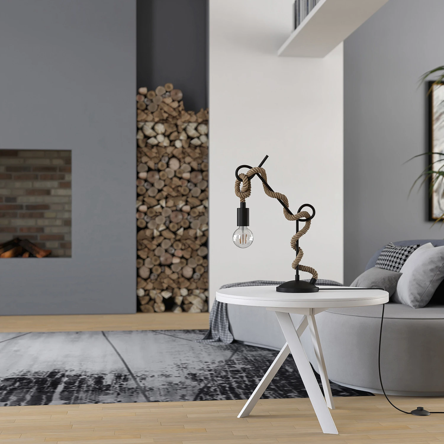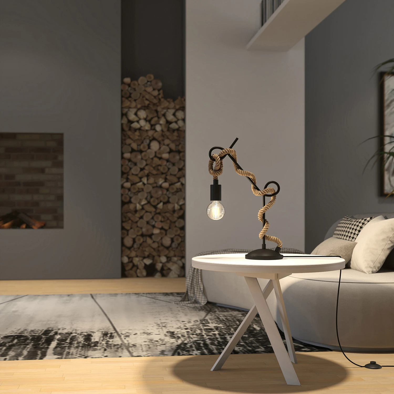 Schwarze Tischleuchte Ropina mit einem Seil als kreativ gestaltete Verkabelung