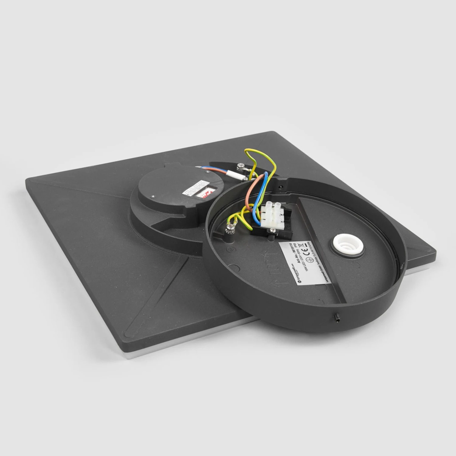 Henni ist recht schlicht gehalten, denn aus den meisten Perspektiven sieht man nur die weiße Polycarbonatabdeckung mit ihrer quadratischen Form. Das aus Aluminium gefertigte Gestell besitzt eine dunkelgraue Oberflächenlackierung und wirkt sehr dezent. Hinter der Abdeckung aus Polycarbonat findet man die warmweißen, energiesparenden LEDs vor, deren Licht gleichmäßig verteilt wird. Mit Henni kann man in überdachten Außenbereichen, wie es zum Beispiel Terrassen, Balkone oder Hauseingänge sein können, eine gute Ausleuchtung erzielen. Damit der Lichtschein sich gezielt einschaltet, ist die LED-Außendeckenlampe Henni mit einem Sensor ausgestattet.
