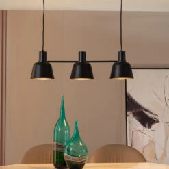 Mattschwarze Balkenpendellampe Servan mit drei Lampenschirmen in designorientierter Formensprache – schön für Küchen und Esszimmer
