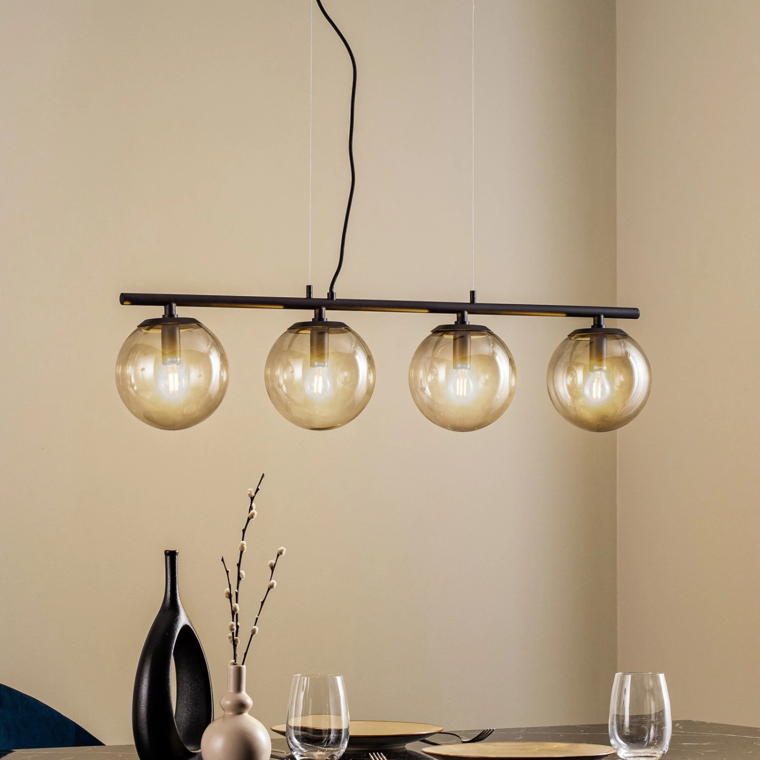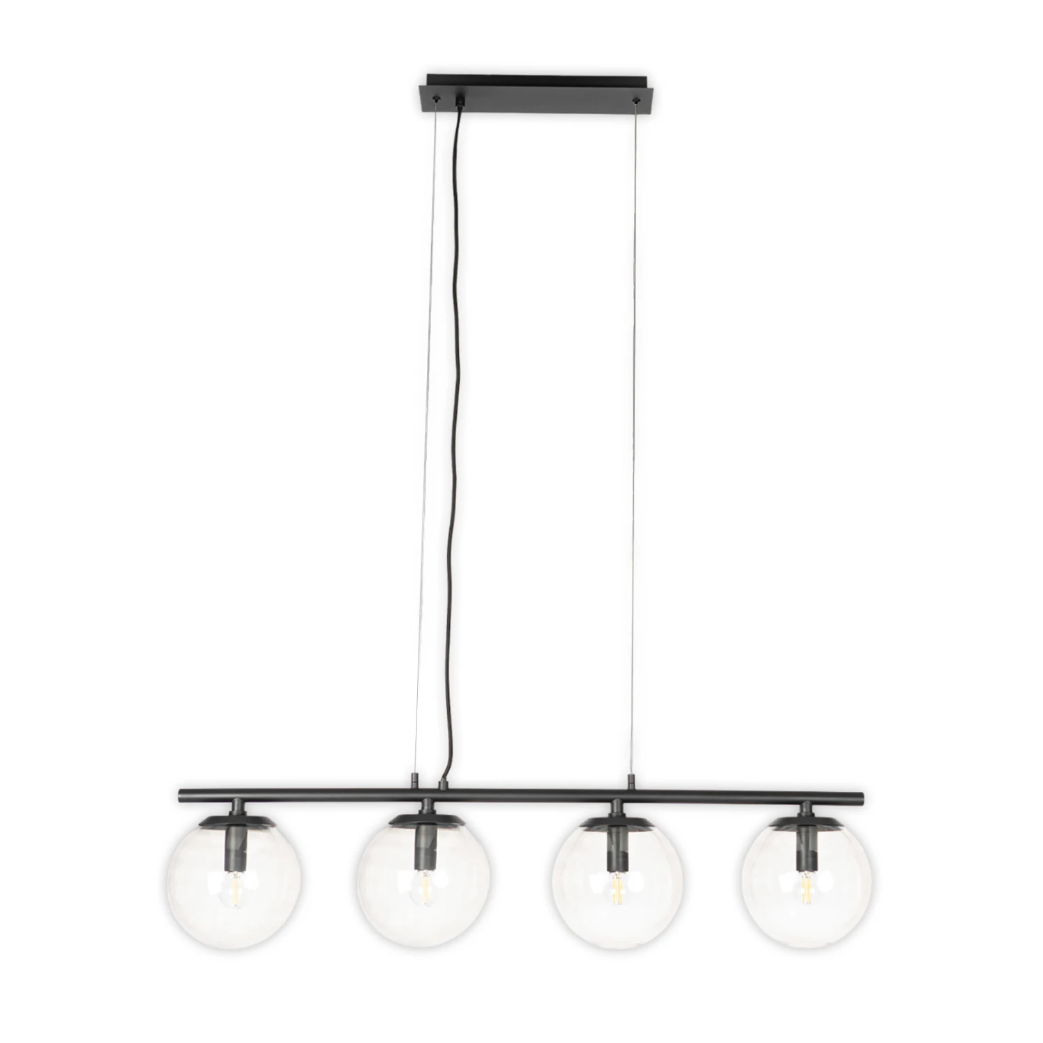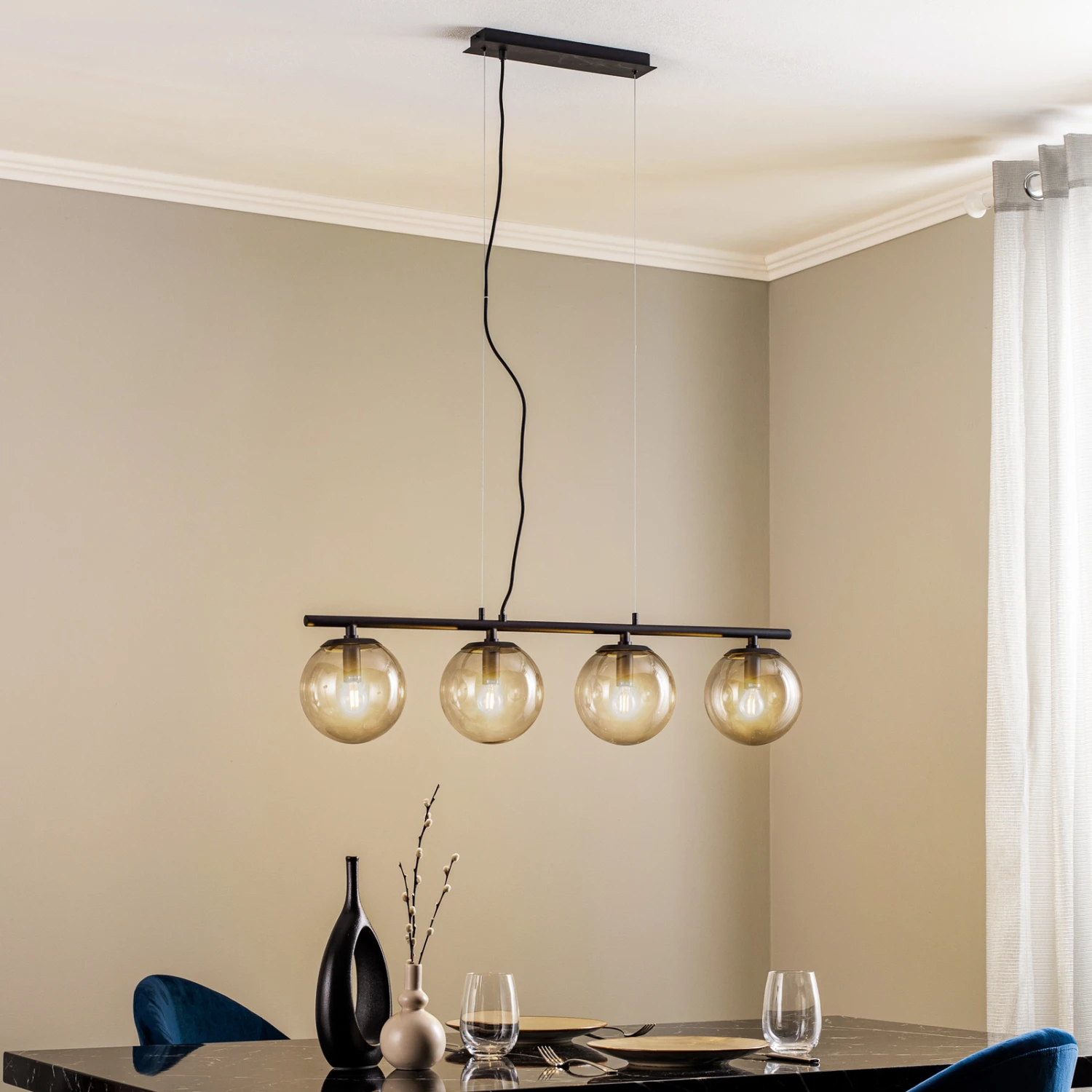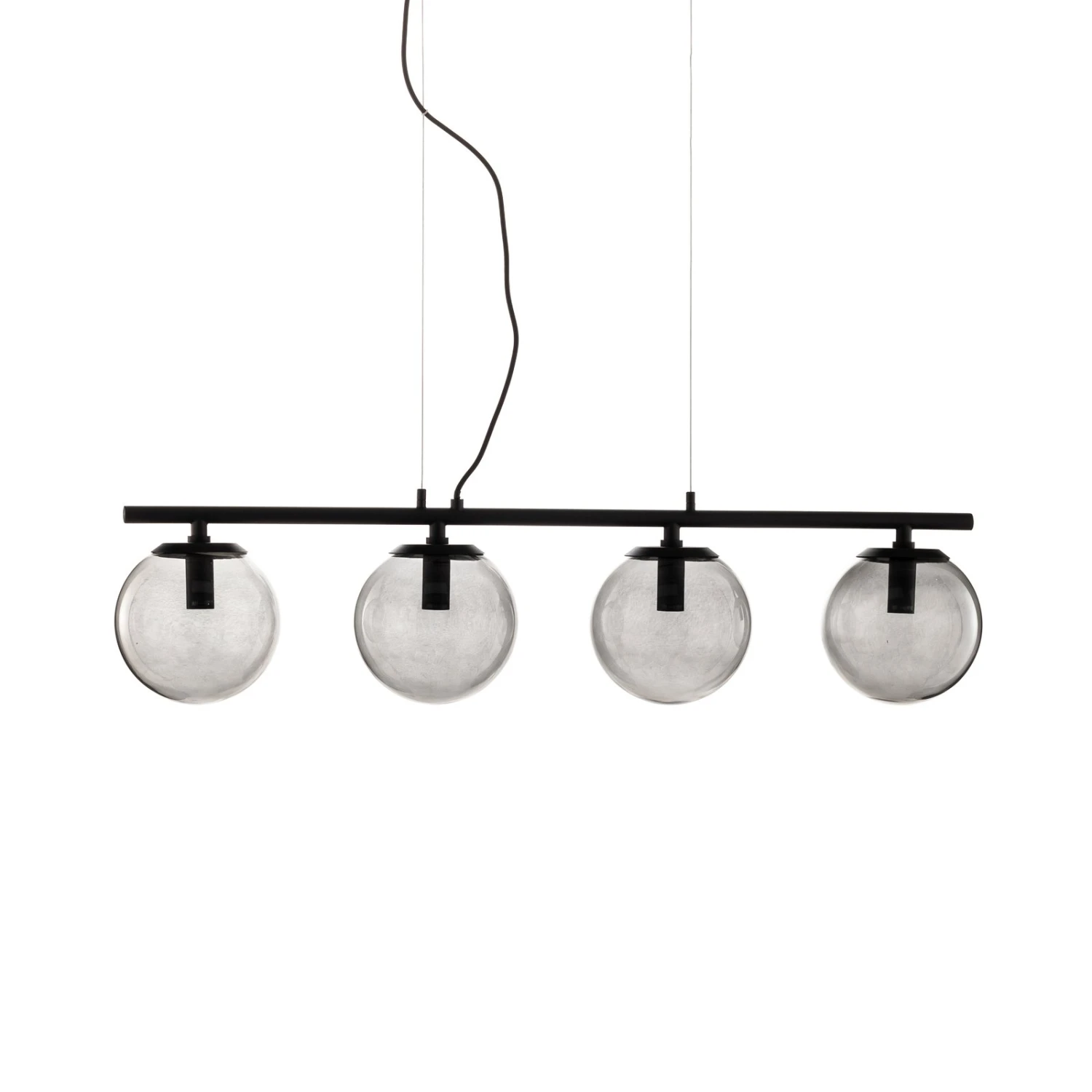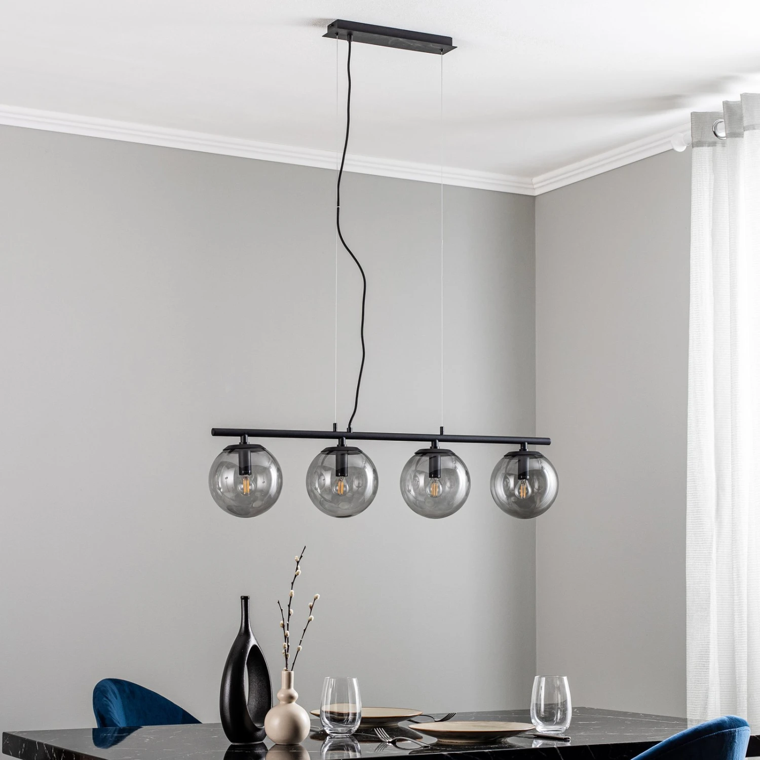 Vierflammige Balkenpendellampe Sotiana mit Glasschirmen in Kugelform und schwarzem Eisengestell