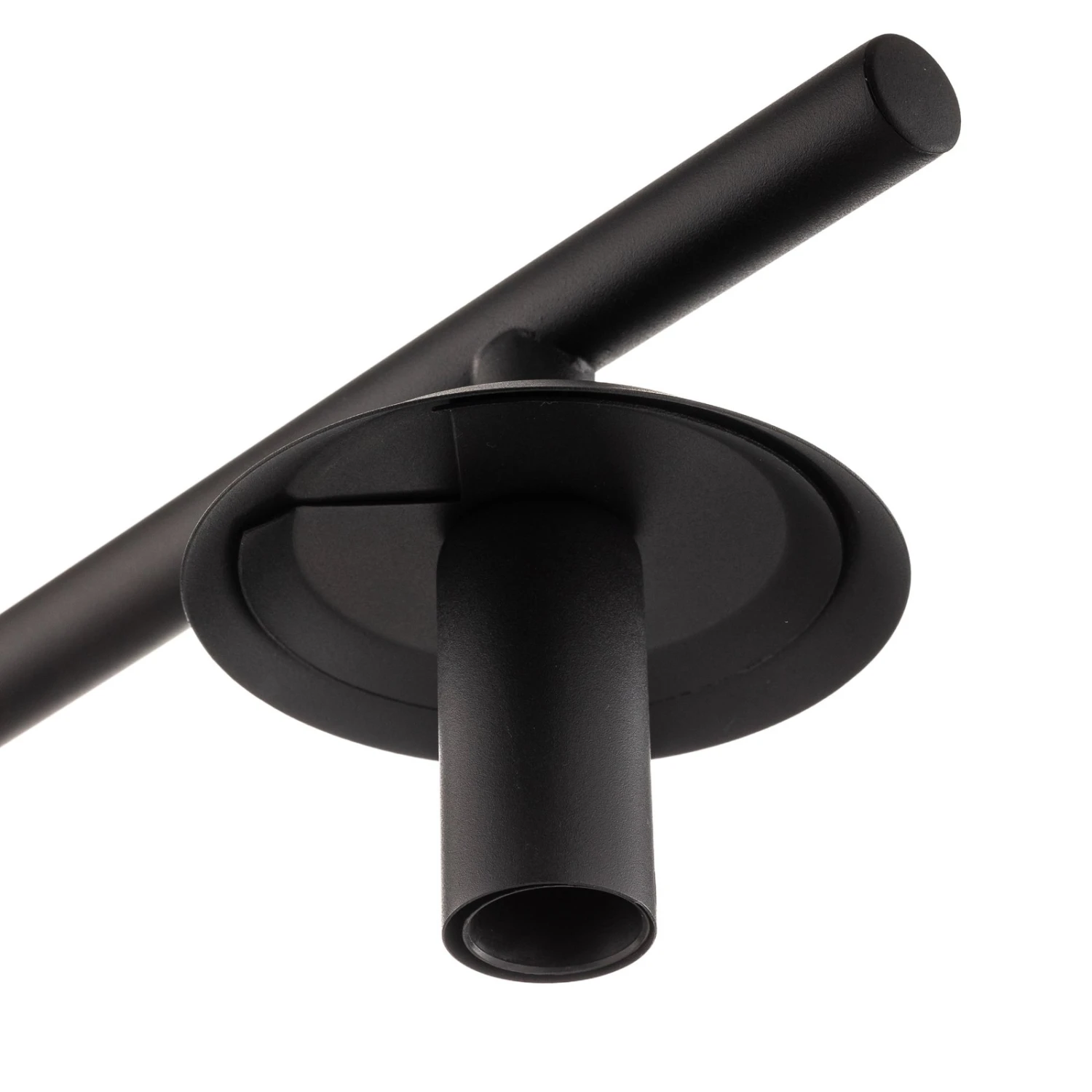 Das Leuchtendesign erscheint geradlinig, versprüht aber auch einen Hauch von Luxus und ist als Neuinterpretation einer klassischen Leuchtengestaltung gedacht. Die Kugelschirme ergänzen den schwarzen Eisenbalken auf sehenswerte Weise und ein Textilkabel, das ebenfalls schwarz ist, führt entlang der filigranen Drahtseilabhängungen nach oben zur Deckenhalterung und Stromeinspeisung.