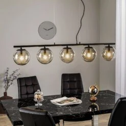 Fünfflammige Balkenpendelleuchte Sotiana mit schwarzem Eisengestell und dekorativen Glaskugeln in Rauchgrau