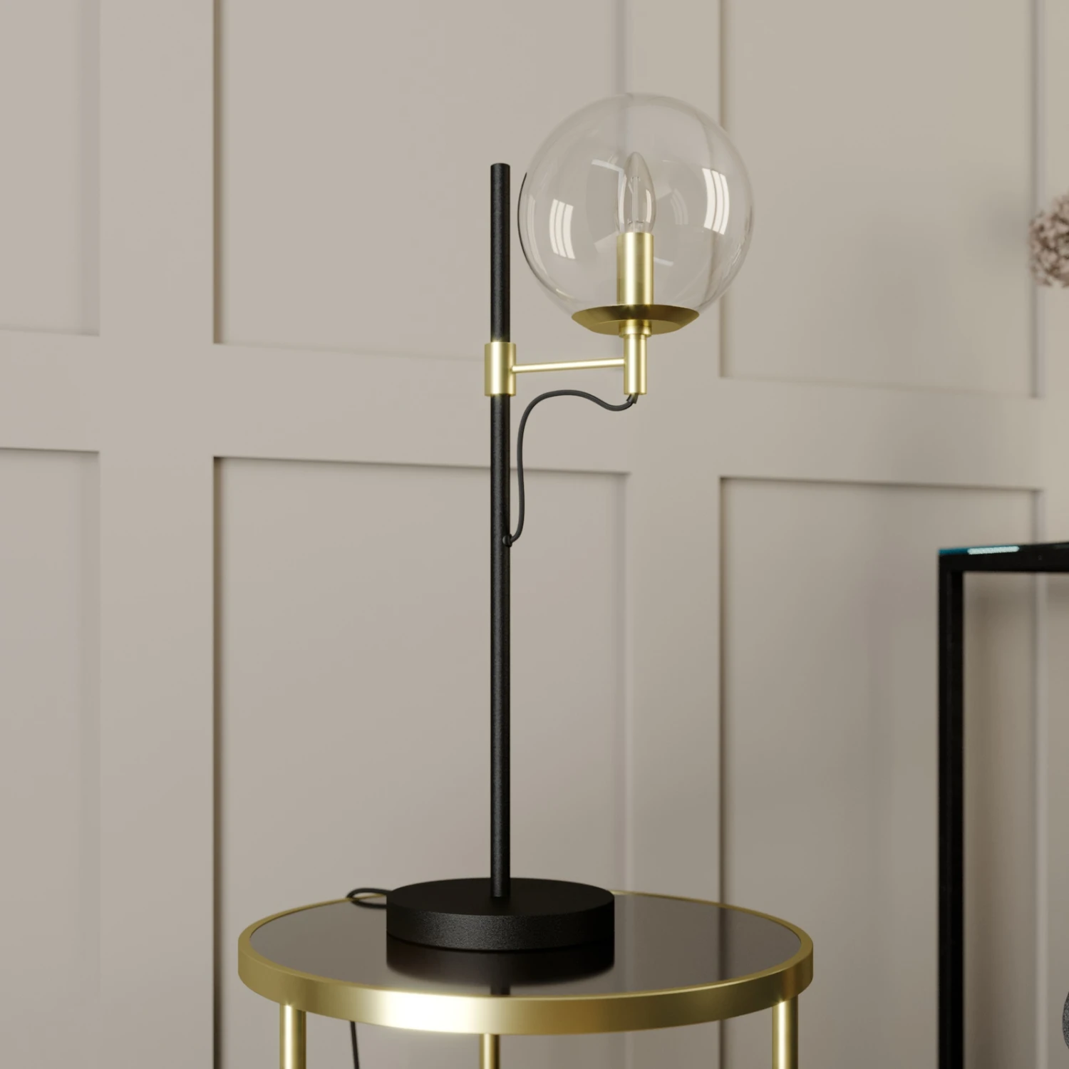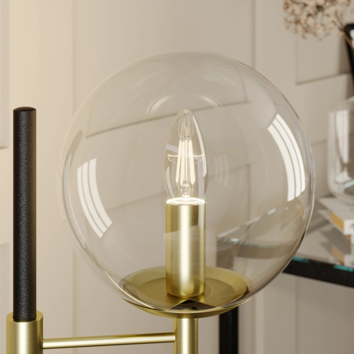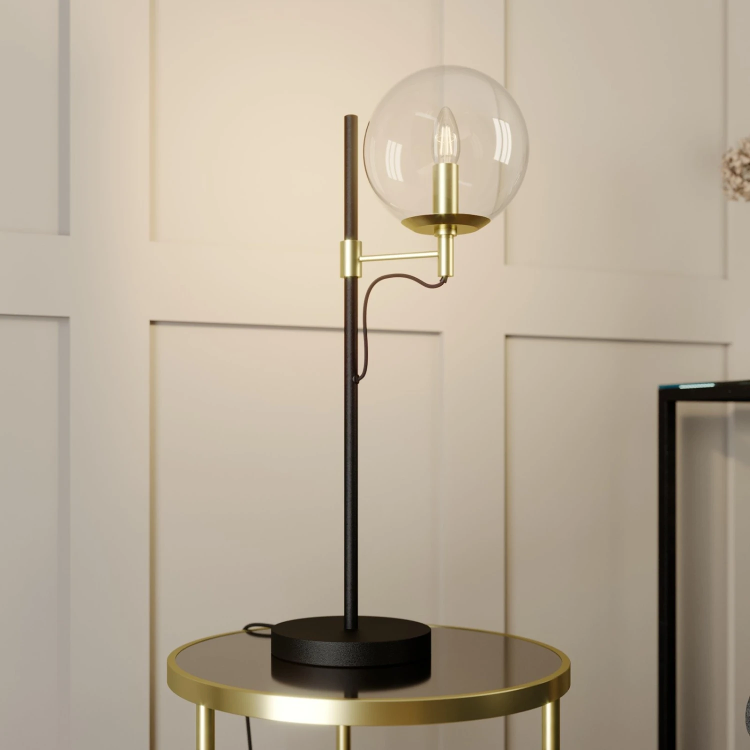 Außergewöhnliche Design-Tischlampe Sotiana mit Glaskugel und Metallelementen in Schwarz und Messing