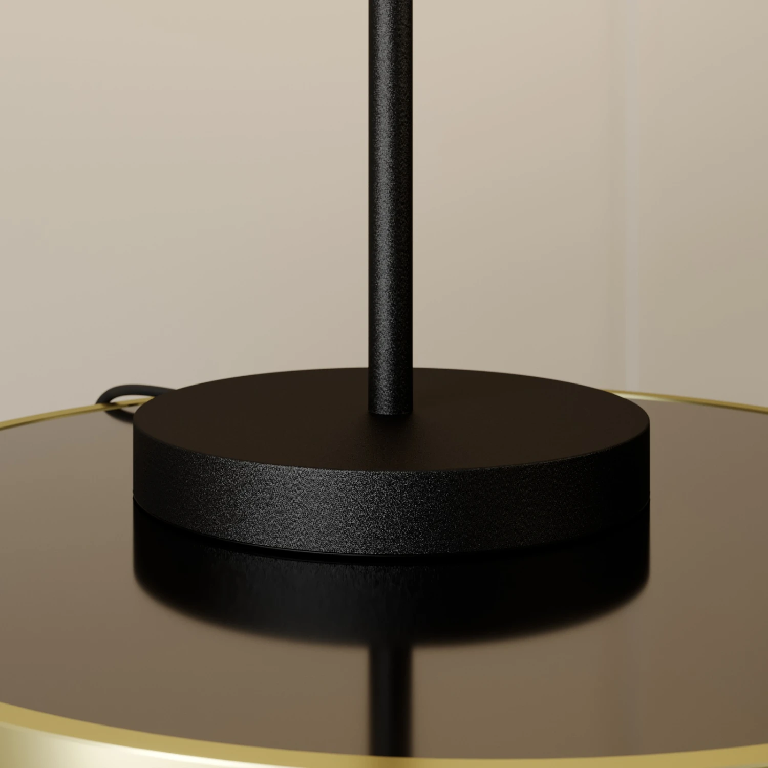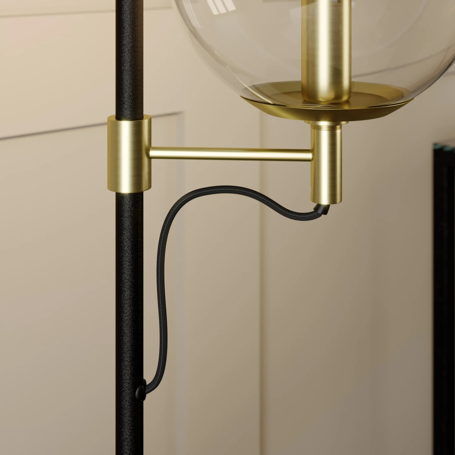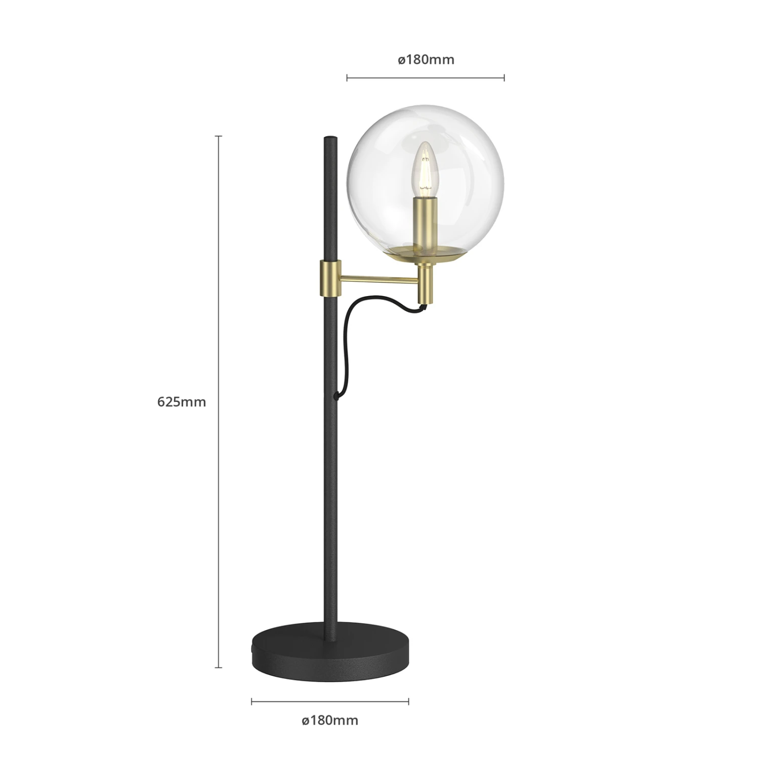 Außergewöhnliche Design-Tischlampe Sotiana mit Glaskugel und Metallelementen in Schwarz und Messing