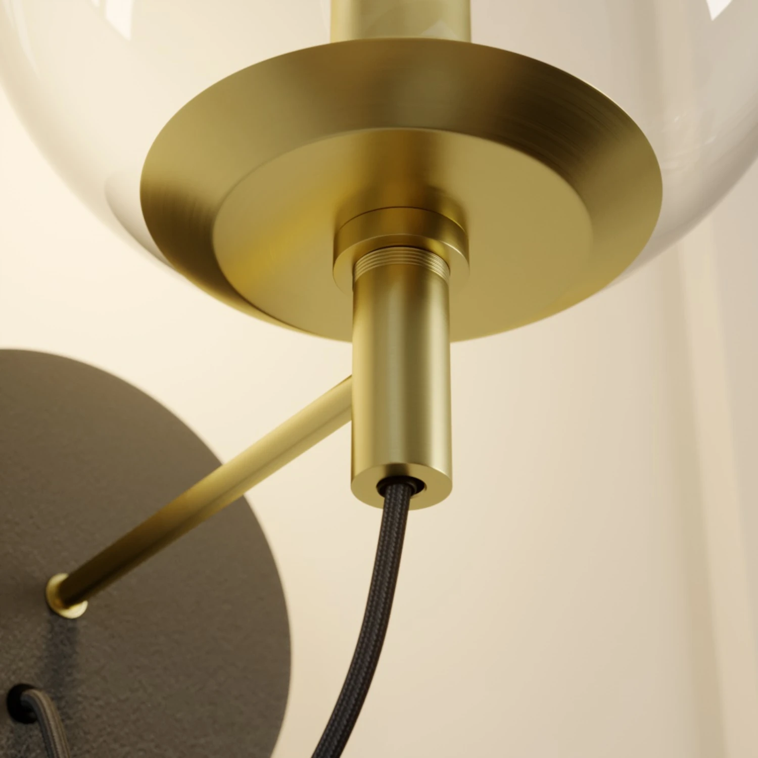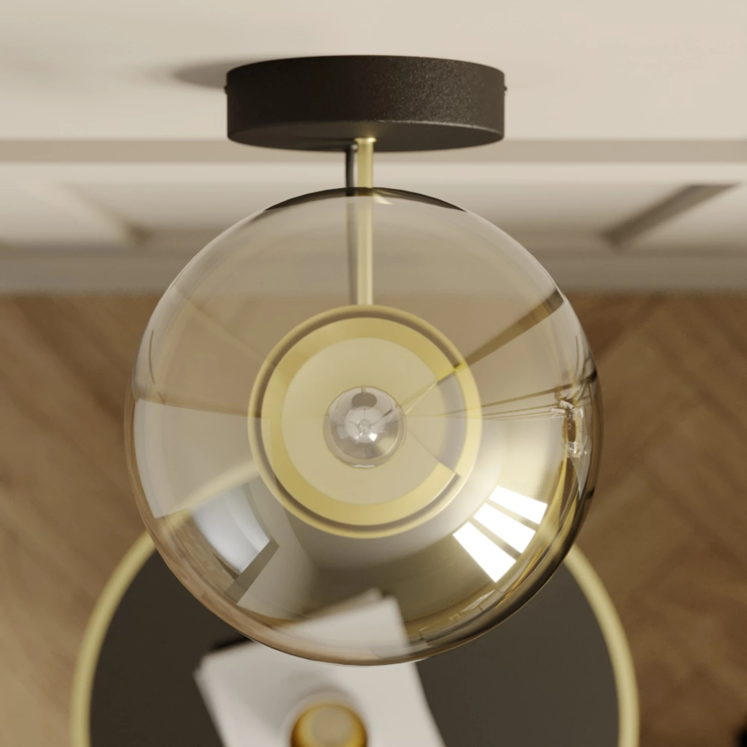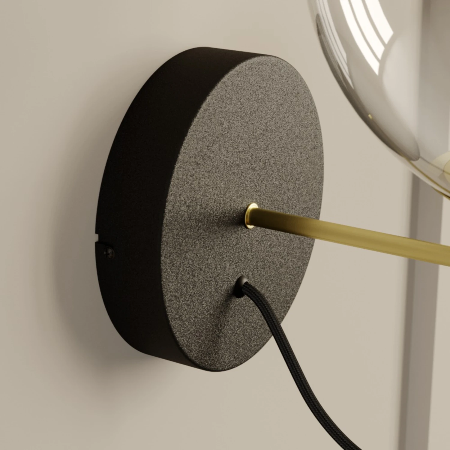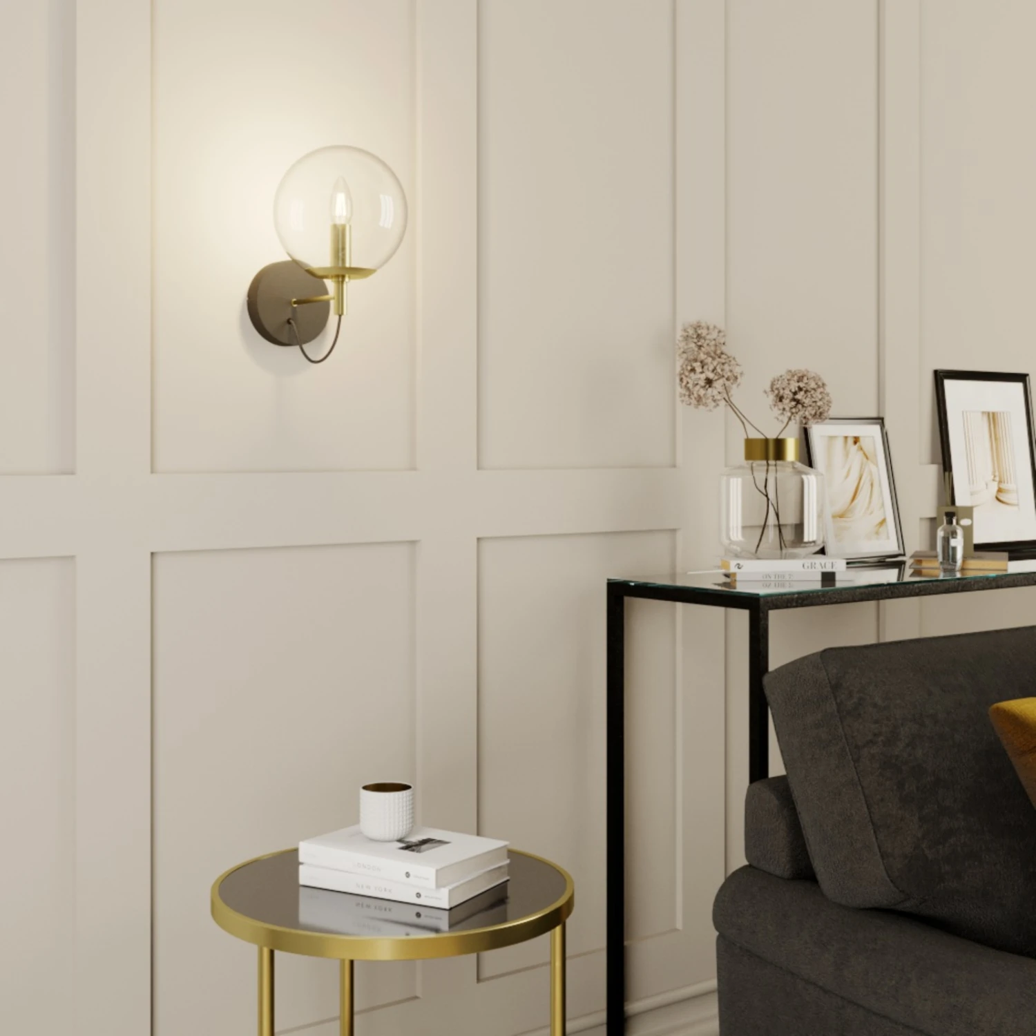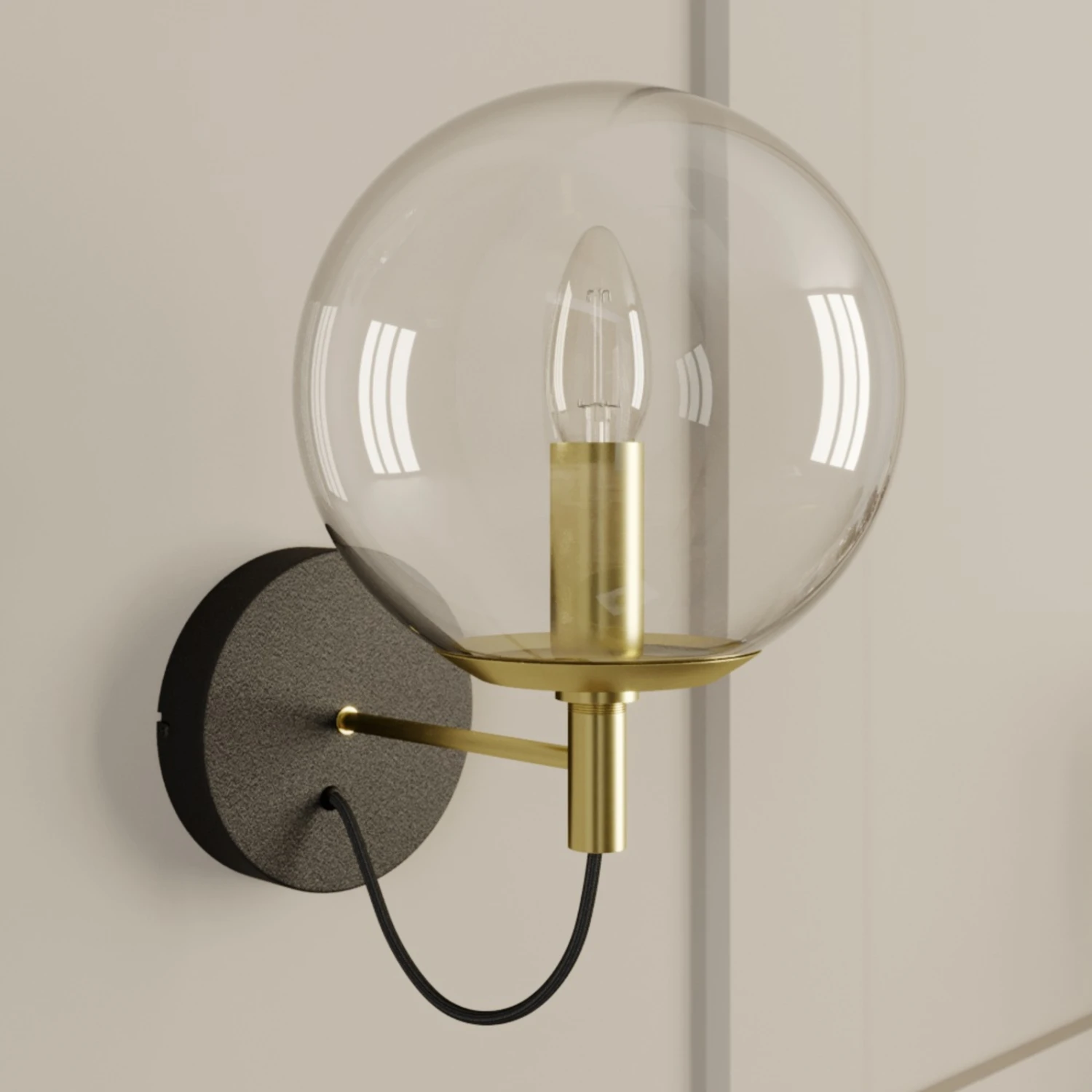Edle Wandleuchte Sotiana mit klarer Glaskugel und Elementen in Messing und Schwarz