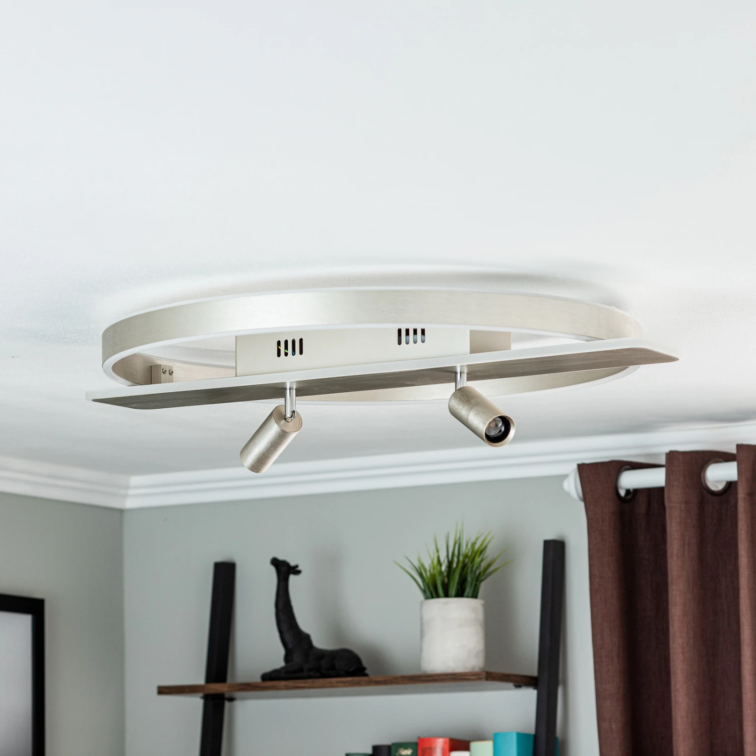 Nickelfarbene LED-Deckenlampe Stigla mit zwei Strahlern und gebürsteter Oberfläche, dimmbar
