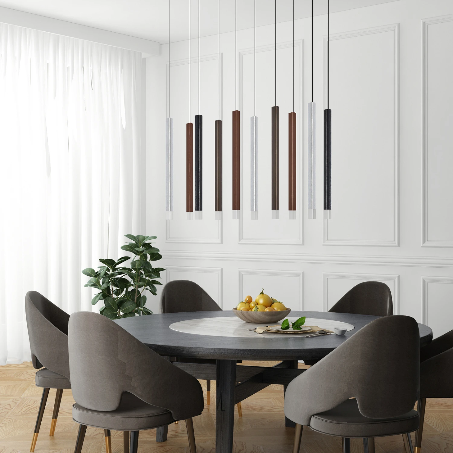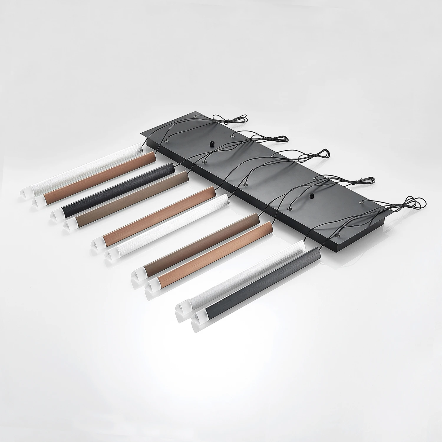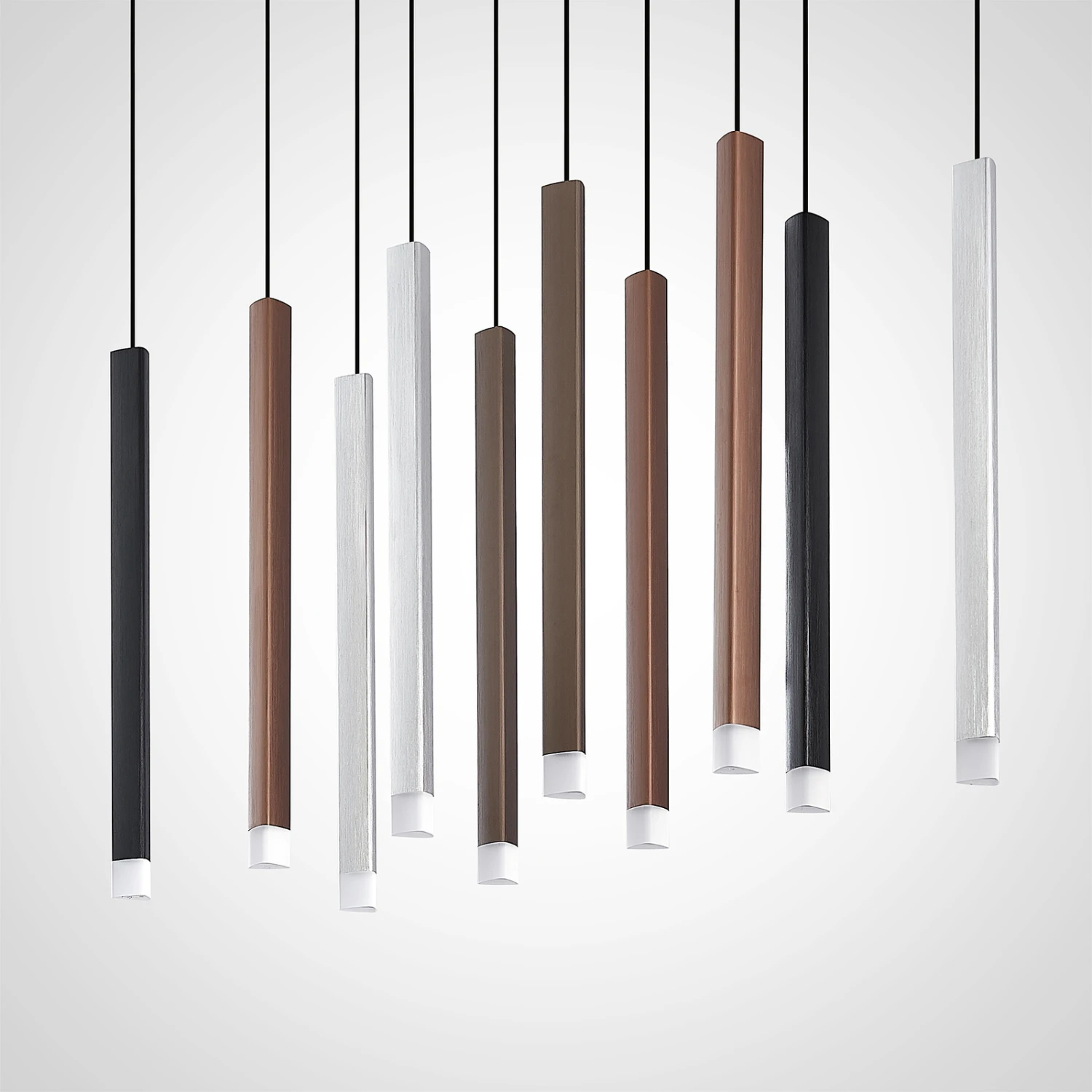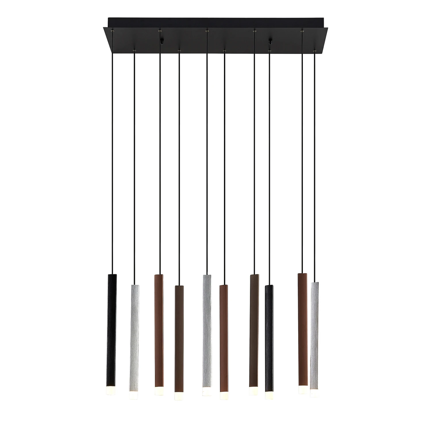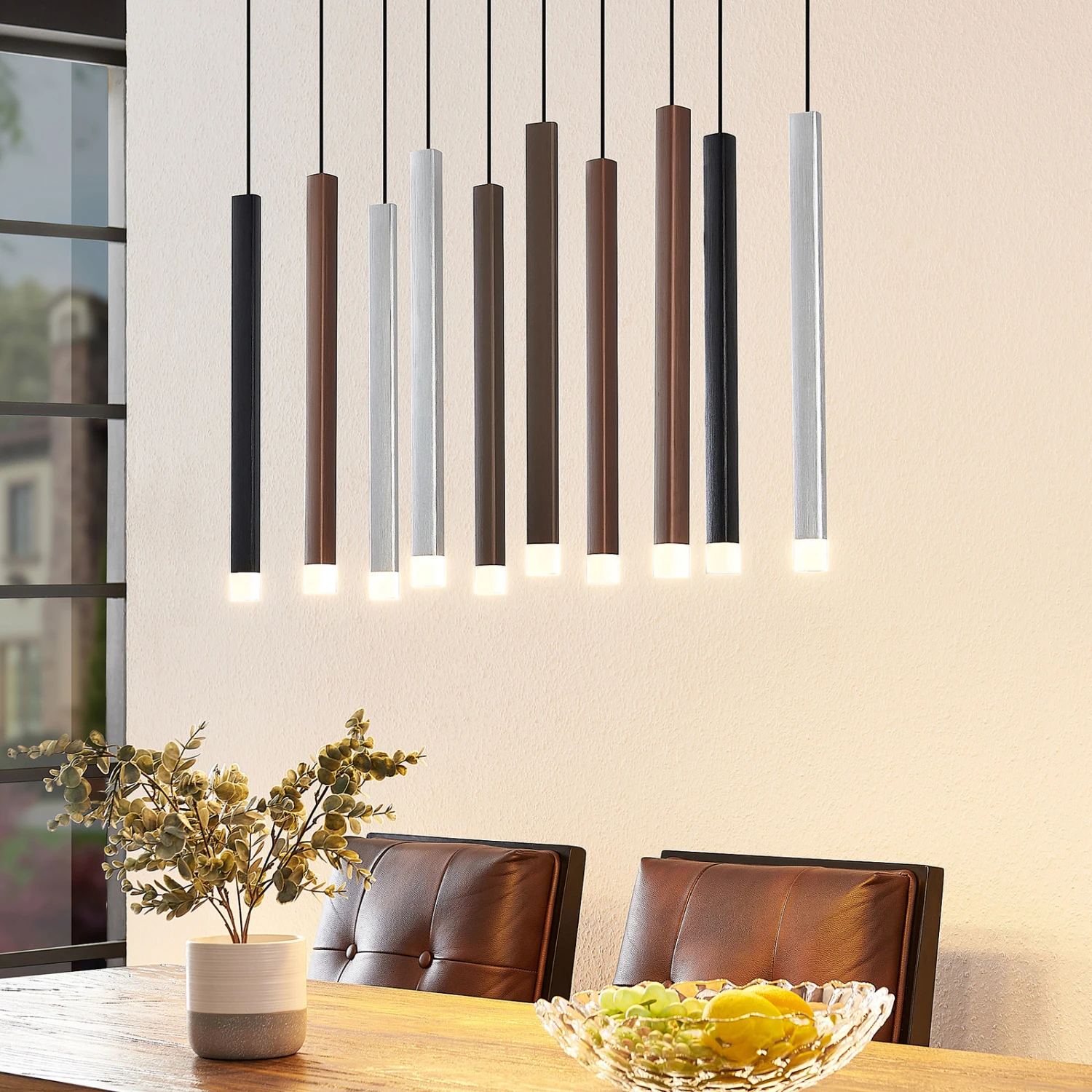 Außergewöhnlich im Design und sparsam im Stromverbrauch – so präsentiert sich die LED-Pendelleuchte Stoika in ihrer zehnflammigen Ausführung. Bei ihrem Design wurde gezielt auf klassische Leuchtenschirme verzichtet. Stattdessen hängen prismenförmige Leuchtkörper an einem Kupferdraht von einem dunklen Baldachin.