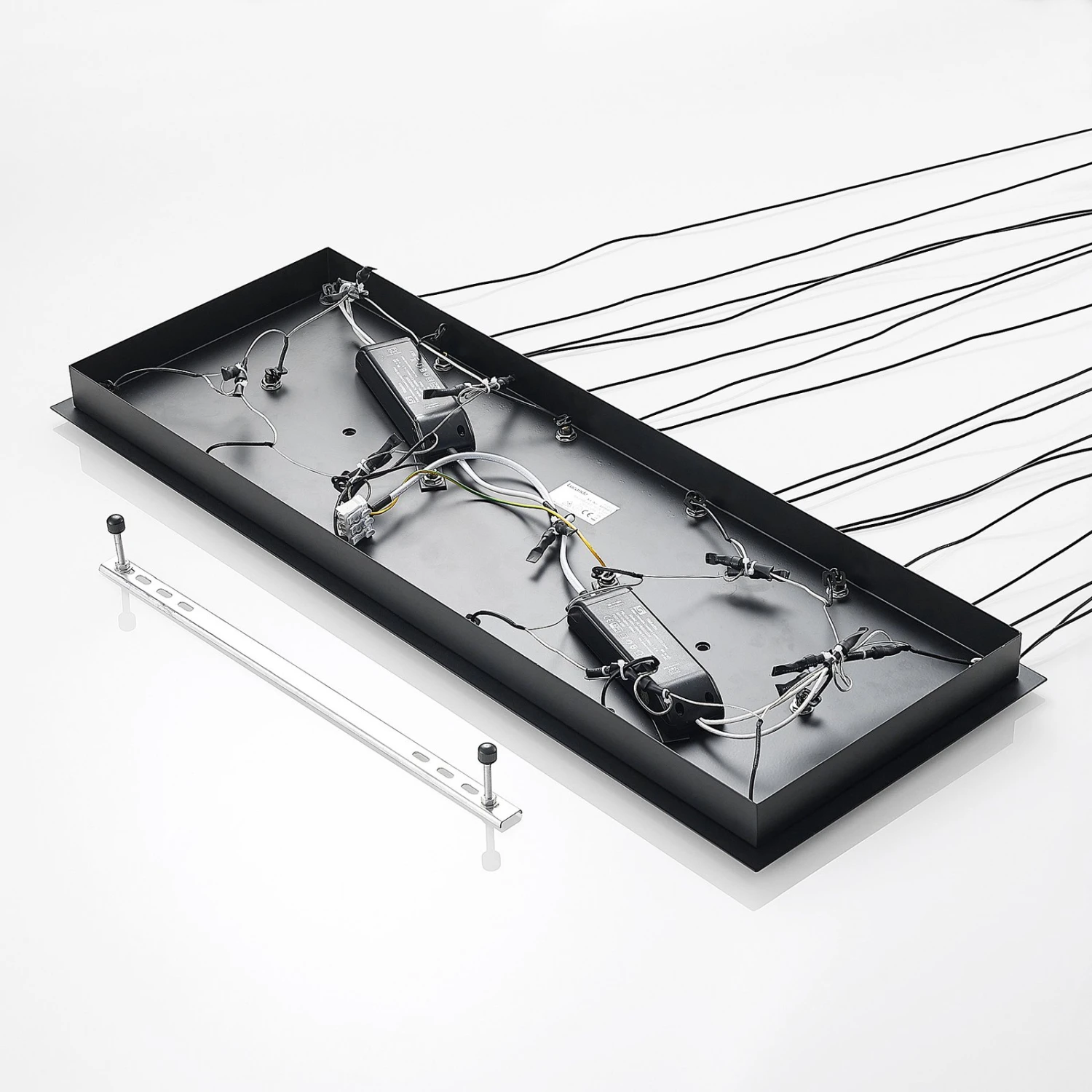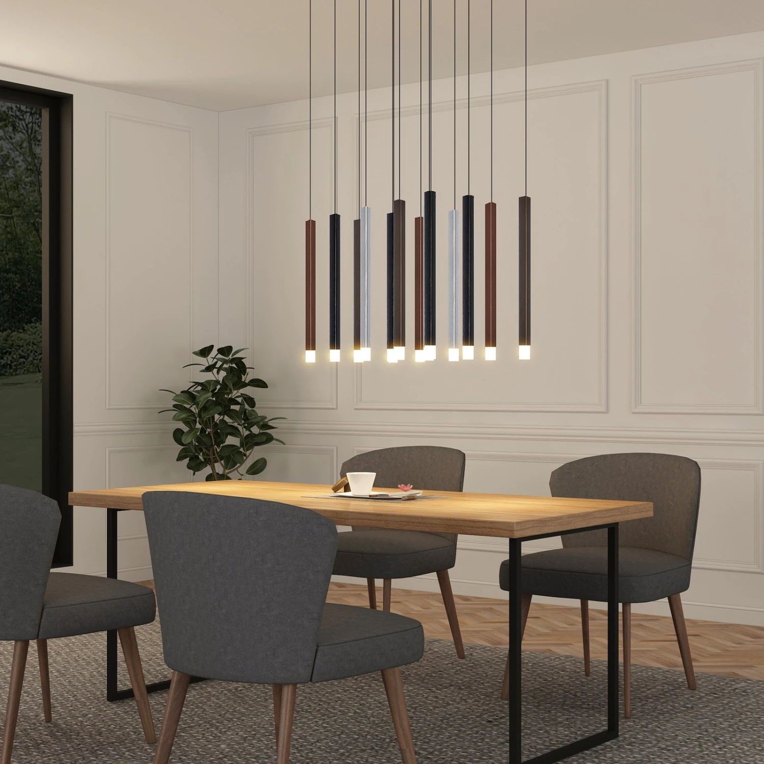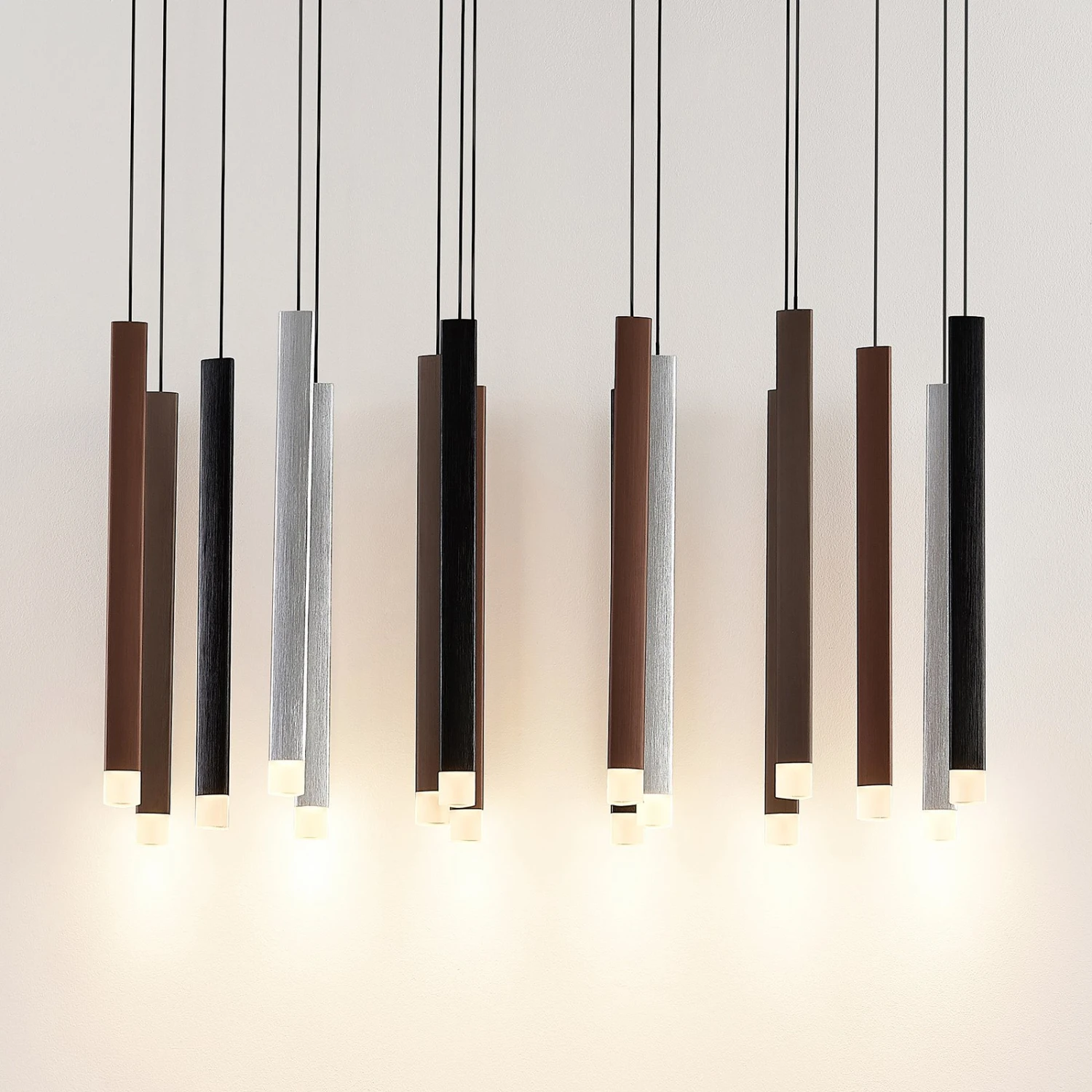Die LED-Pendelleuchte Stoika begeistert auf Anhieb in ihrer 16-flammigen Ausführung. Die Deckenhalterung ganz in mattem Schwarz fällt sofort mit ihrer rechteckigen Form ins Auge. Die herabhängenden Leuchtenstäbe wurden mit unterschiedlichen Farben versehen, die jedoch gut miteinander harmonieren und den besonderen Charakter dieser Leuchte unterstreichen.