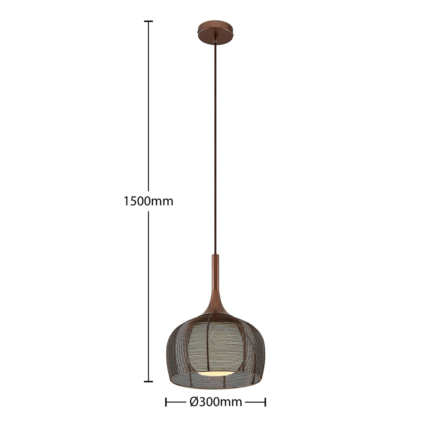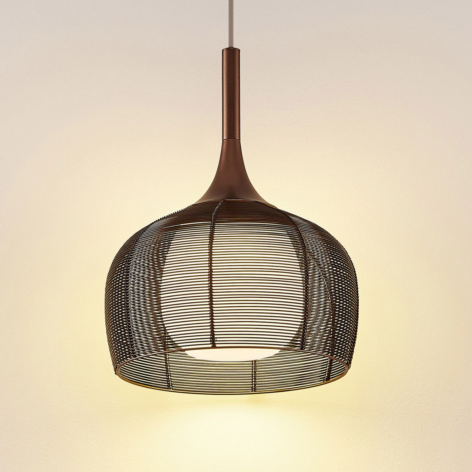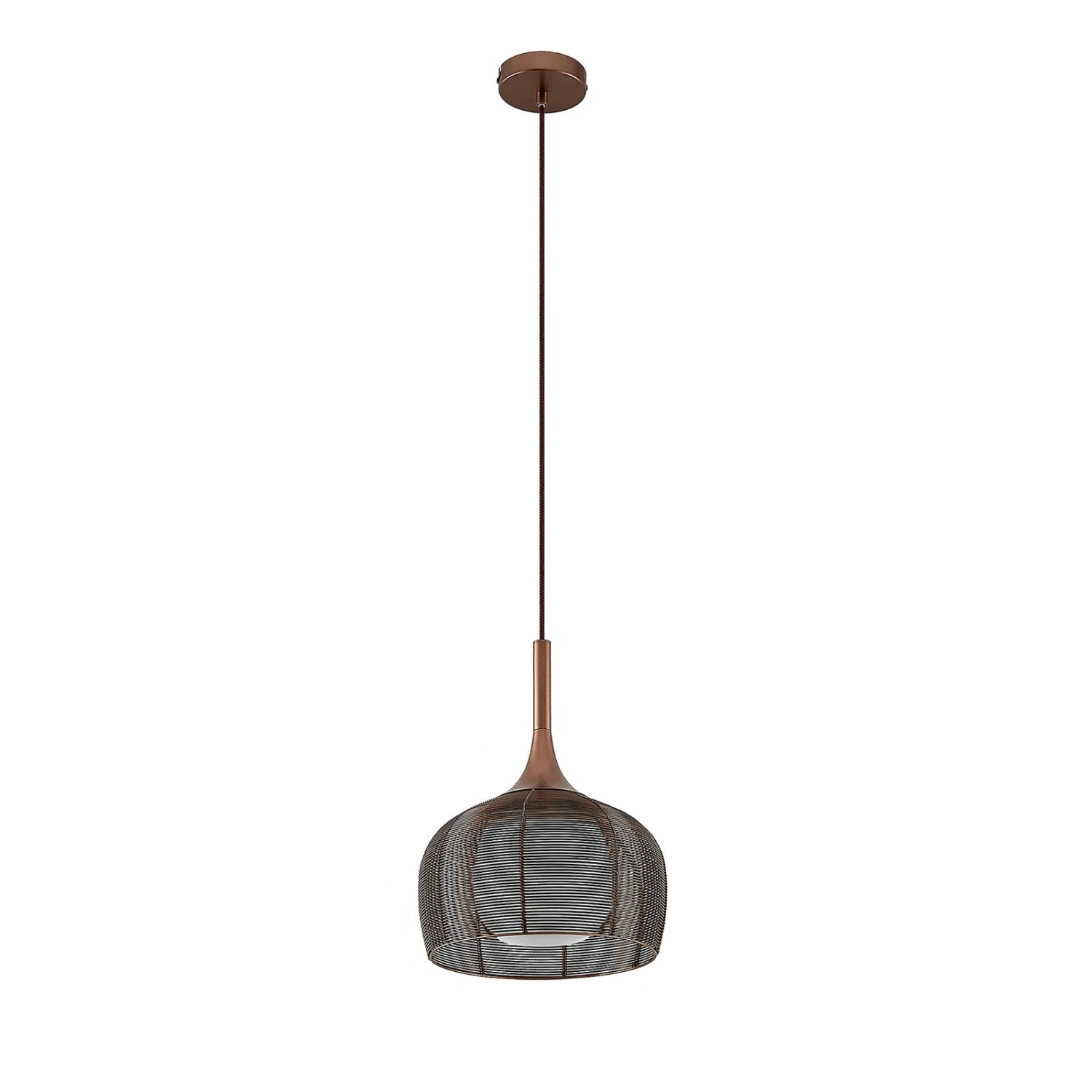 Diese Hängeleuchte eignet sich hervorragend für die Nutzung über einem Esstisch in der Küche oder einem Tresen im Wohnbereich. Der Lampenschirm besteht aus einem käfigähnlichen Metallgeflecht und er besitzt viele Auslässe und ist in einem attraktiven Kaffeeton gehalten, der farblich ganz den Trends unserer Zeit entspricht. Um den Lichtschein so gleichmäßig wie möglich nach außen treten zu lassen, wurde der äußere Schirm ergänzt um einen weißen Glasschirm im Inneren der Leuchte. So dringt das Licht besonders sanft an die Umgebung und entweicht vor allem nach unten, wo sich keine Abdeckung befindet und der Lichtschein frei austreten kann. Damit ist die Pendelleuchte schön für die Flächenbeleuchtung über einem Tisch geeignet. Das E27-Leuchtmittel kann nach Belieben gewählt werden, idealerweise mit effizienten LEDs.