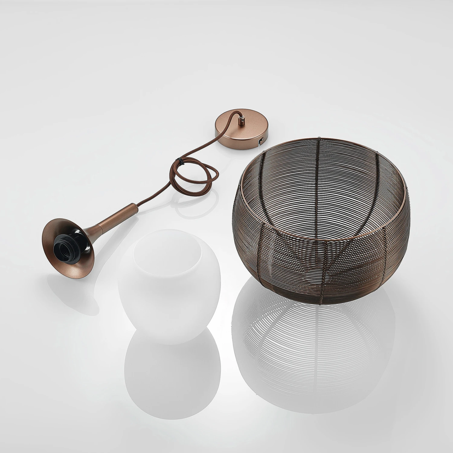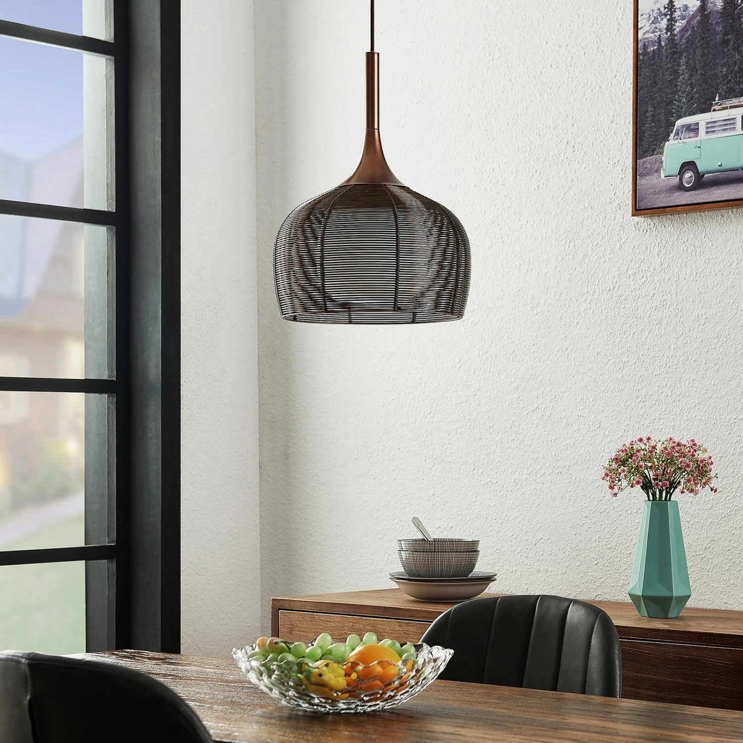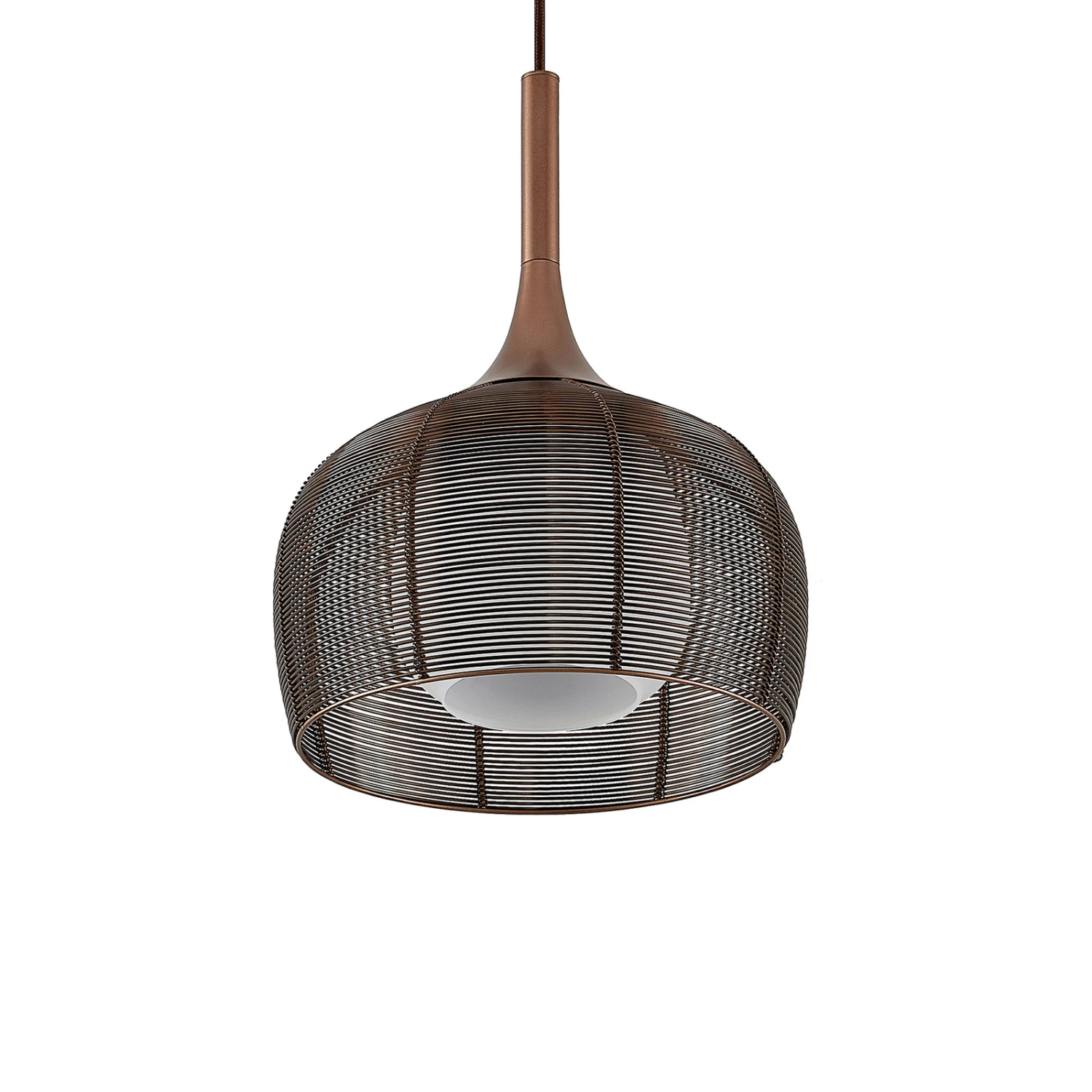 Diese Hängeleuchte eignet sich hervorragend für die Nutzung über einem Esstisch in der Küche oder einem Tresen im Wohnbereich. Der Lampenschirm besteht aus einem käfigähnlichen Metallgeflecht und er besitzt viele Auslässe und ist in einem attraktiven Kaffeeton gehalten, der farblich ganz den Trends unserer Zeit entspricht. Um den Lichtschein so gleichmäßig wie möglich nach außen treten zu lassen, wurde der äußere Schirm ergänzt um einen weißen Glasschirm im Inneren der Leuchte. So dringt das Licht besonders sanft an die Umgebung und entweicht vor allem nach unten, wo sich keine Abdeckung befindet und der Lichtschein frei austreten kann. Damit ist die Pendelleuchte schön für die Flächenbeleuchtung über einem Tisch geeignet. Das E27-Leuchtmittel kann nach Belieben gewählt werden, idealerweise mit effizienten LEDs.