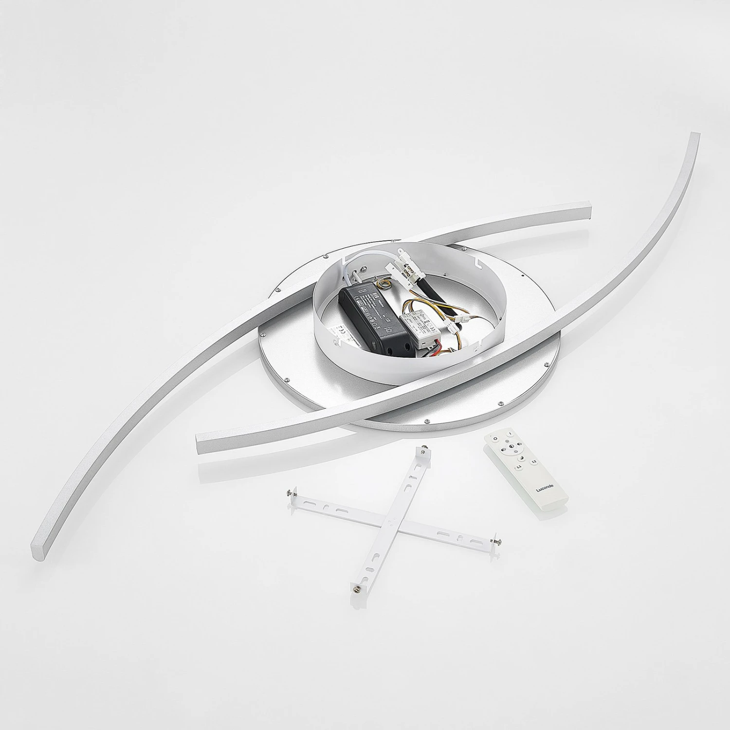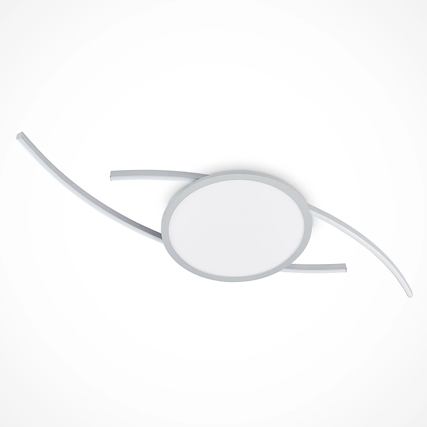Die LED-Deckenlampe Tiaro besitzt ein modernes Design und praktische Eigenschaften, welche sie zur perfekten Begleiterin machen, wenn es um die Beleuchtung eines Wohnzimmers oder Schlafzimmers geht. Sie besteht aus Eisen und Aluminium und ist in Silber lackiert. Ihr Leuchtenkörper besteht aus einem kreisrunden Element, welches an zwei schwungvoll gebogenen Streben angebracht ist. Durch die Fernbedienung lassen sich die zweckmäßigen Funktionen der Leuchte mühelos steuern. So können die festverbauten LEDs stufenlos in ihrer Helligkeit (10 % – 100%) und hinsichtlich ihrer Lichtfarbe dreistufig (2.700 K, 4.000 K und 6.500 K) geändert werden. Das moderne Design der LED-Deckenleuchte Tiaro passt hervorragend in einen zeitgemäßen Einrichtungsstil und kann bedenkenlos im Innenbereich angebracht werden, ohne Gefahr zu laufen, dass sie das restliche Mobiliar überschattet.