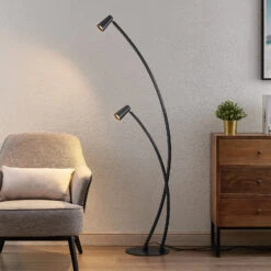 Velanoris ist ganz in Schwarz gehalten und verfügt über zwei Lichtquellen, die sich auf unterschiedlicher Höhe befinden. Dabei sind beide Stangen gebogen und können deshalb in einer gewissen Abstraktion zu den beliebten Bogenlampen gezählt werden, die im Wohnzimmer gut als Lesebeleuchtung genutzt werden können. Die schwarze Oberfläche wirkt markant und elegant und lässt sich gut mit modernem Interieur kombinieren, während die beiden Schirme aussehen wie Becher oder Kelche und sich zudem schwenken lassen, um eine optimale Lichtausrichtung zu erzielen. Im schwarzen Textikabel befindet sich ein Trittschalter, wodurch man die Leuchte bequem ein- und ausschalten kann, ohne sich bücken zu müssen.