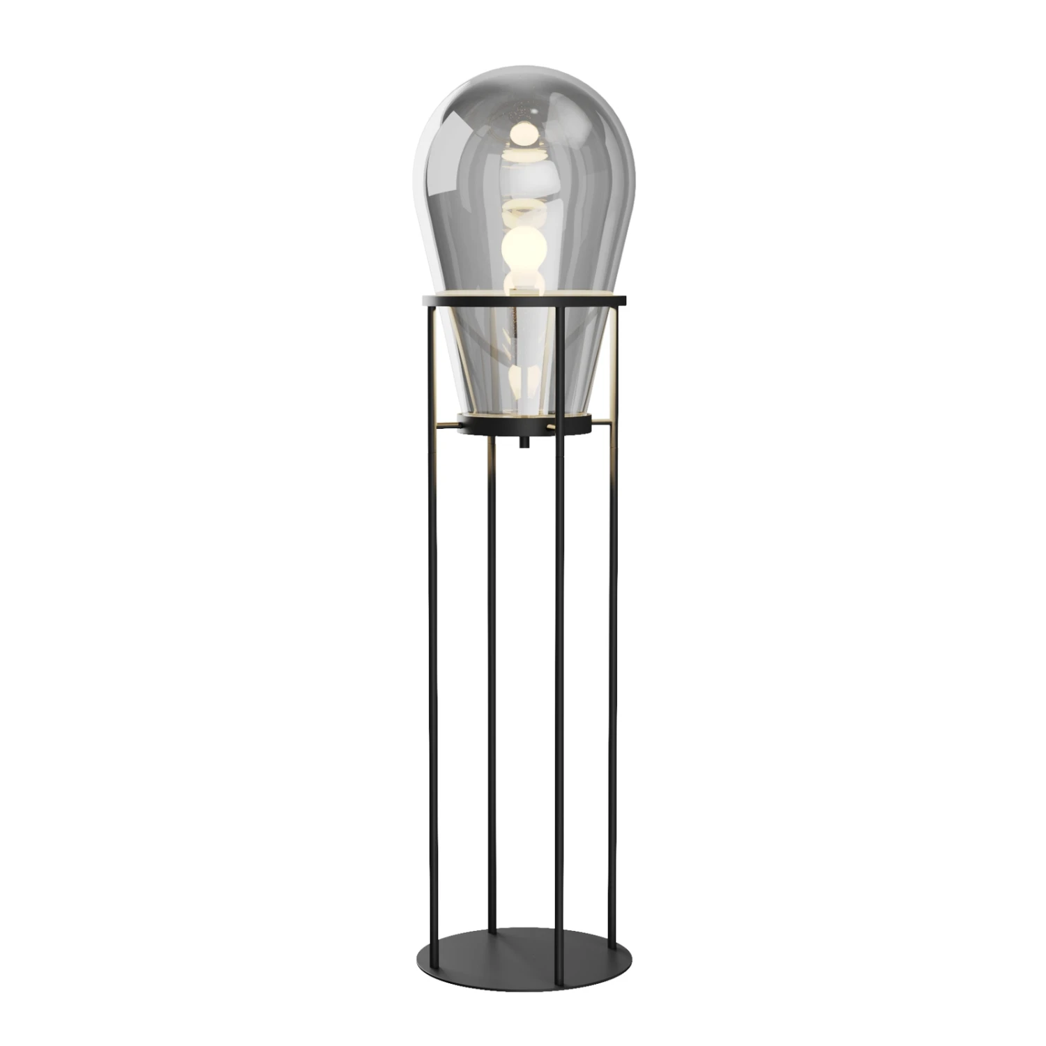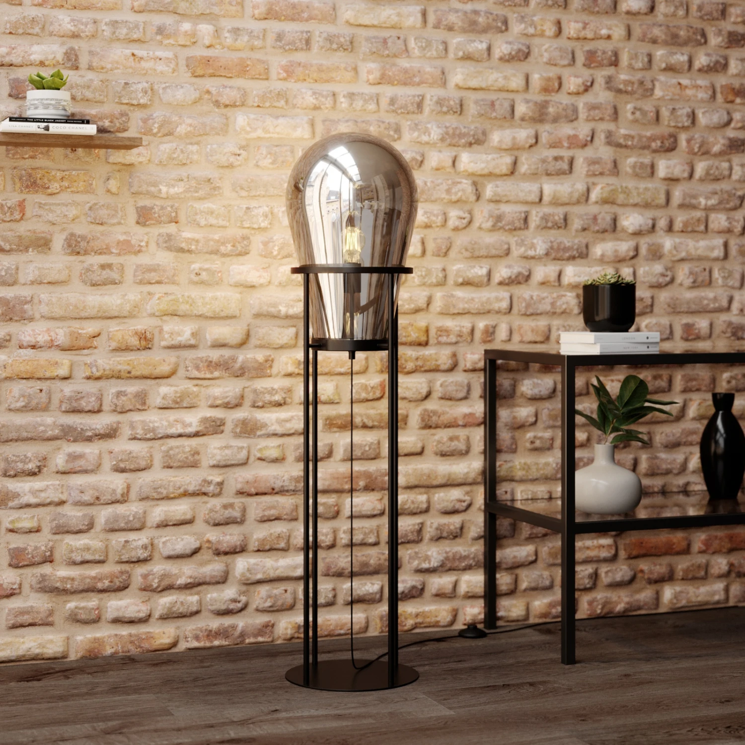 Schönes Vintageobjekt mit leuchtendem Glasballon: die Stehleuchte Viyan in Schwarz und Rauchgrau