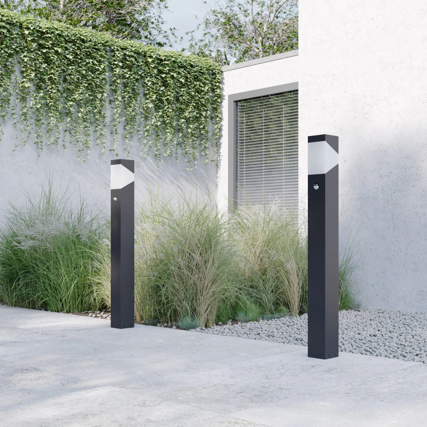 Aluminium-Wegeleuchte Kiran mit integriertem Bewegungsmelder Man erkennt es bereits beim ersten Blick: Die Linie ist das formgebende Merkmal dieser modern erscheinenden Wegeleuchte aus Aluminium. Der Leuchtenkörper präsentiert sich ausschließlich kantig, Wölbungen scheint man vergeblich zu suchen. Diese Optik ist das, was die Wegeleuchte für modern gestaltete Hausumgebungen und Zufahrtswege empfiehlt. Als besonderes Detail kann der weiße Polycarbonatdiffusor gewertet werden, der seitlich in Form eines Dreiecks oder – wenn man genau hinschaut – eigentlich in Trapezform in die Leuchte eingelassen ist und für ein kontrastreiches, aber dennoch harmonisches Erscheinungsbild sorgt. Der integrierte Bewegungsmelder bedeutet ein Plus an Funktionalität und Komfort, denn durch ihn schaltet sich das Licht immer dann ein, wenn es benötigt wird, und das Gefühl, im Dunkeln zu stehen, gehört somit der Vergangenheit an. – Erfassungswinkel: 120° – Reichweite: max. 9 m – Leuchtzeit einstellbar von 5 Sekunden bis 8 Minuten
