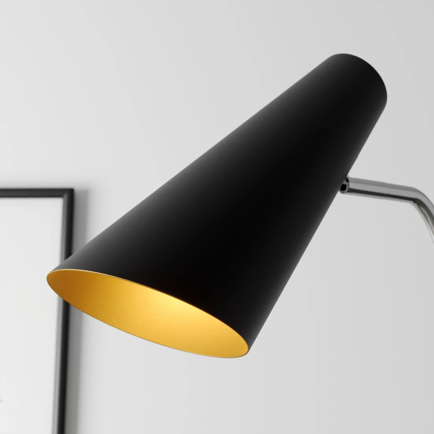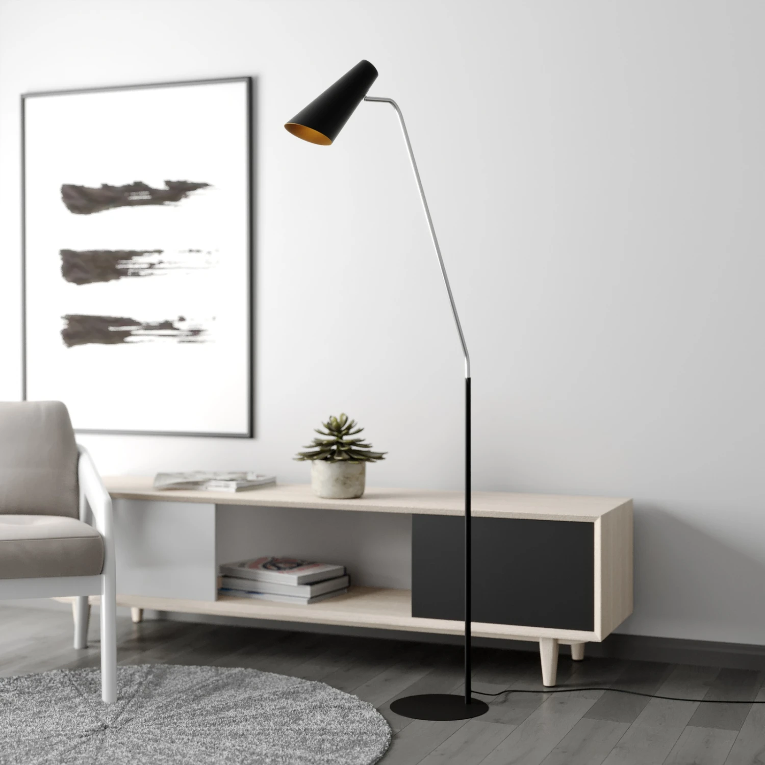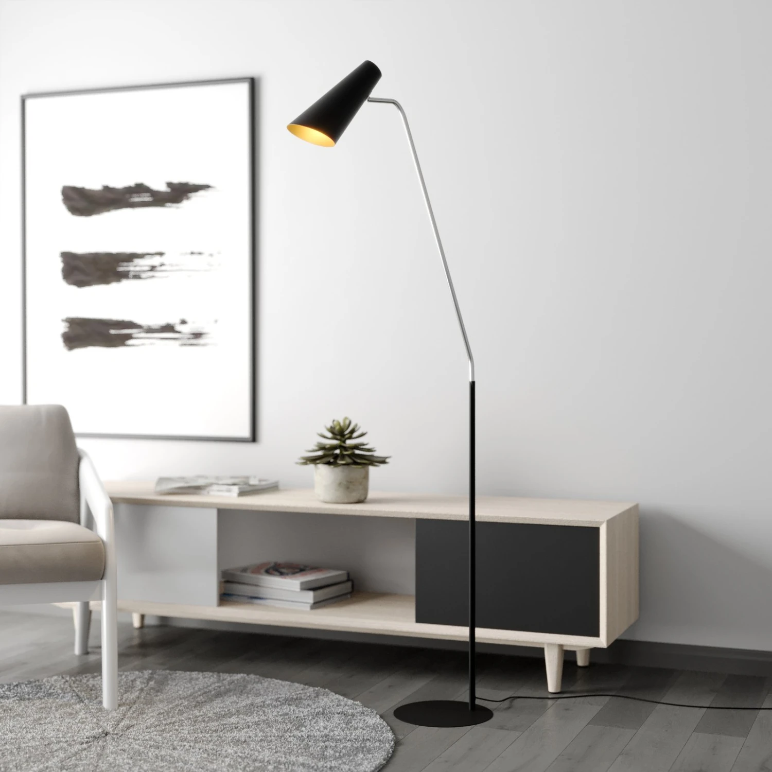 Eher schlicht, aber trotzdem sehr modern ist das Design der Stehleuchte Wibke. Diese besitzt einen konisch geformten Lampenschirm, der verstellbar und mit einer gold lackierten Innenseite ausgestattet ist. Auf der oberen Seite des Schirms befindet sich ein praktischer Ein-/Ausschalter, mit dessen Hilfe die Stehleuchte bequem bedient werden kann. Das Gestell ist neben dem schlichten Schwarz noch mit einem Part aus Chrom abgesetzt, was die Farbgebung harmonisch, aber dennoch spannend macht. Alles in allem bietet Wibke eine moderne Zusatzbeleuchtung, die aufgrund ihrer Größe und dem nach unten strahlenden Licht perfekt für den Einsatz am Lieblingssessel oder direkt neben der Couch ist.