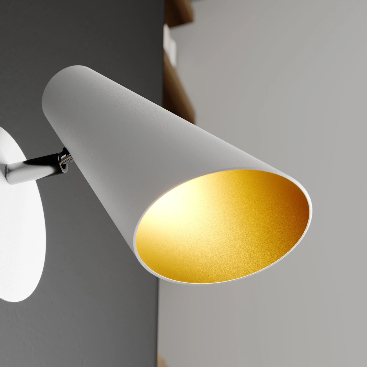 Die modern gestaltete Wandleuchte Wibke orientiert sich optisch am skandinavischen Stil. Ihr Lampenschirm ist konisch gearbeitet und im Innern golden lackiert. Bei Einschalten des Lichts erzeugt die ansonsten reinweiß gehaltene Wandlampe eine angenehme und wohlige Atmosphäre. Ein praktischer Schalter, der direkt auf der Oberseite des Schirms angebracht ist, macht die Bedienung der Lampe Wibke kinderleicht. Der Lampenschirm ist zudem beweglich, womit die Ausrichtung des Lichts individuell angepasst werden kann. Das macht Wibke zu einem modischen Zusatzlicht für die Leseecke oder das moderne Wohnzimmer.
