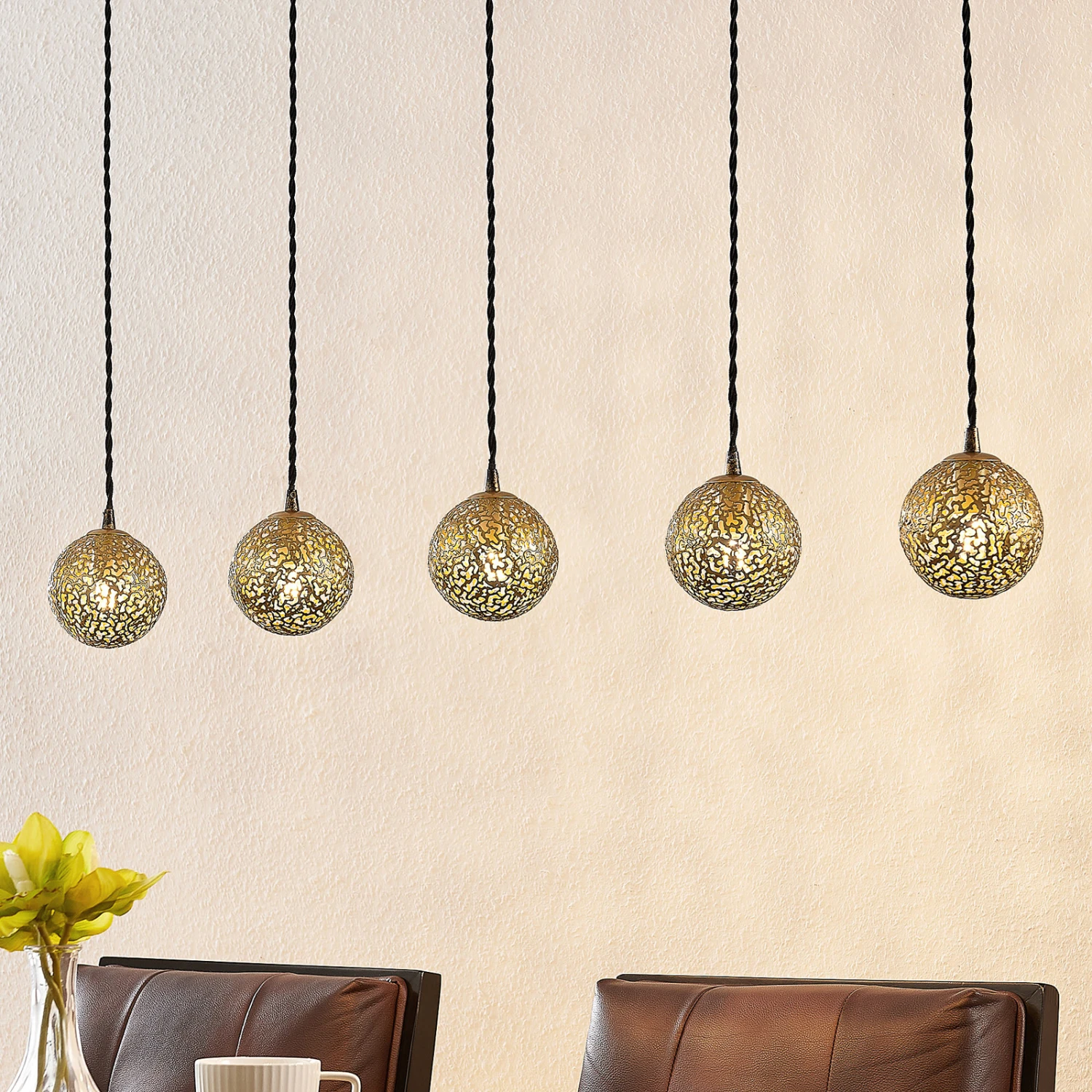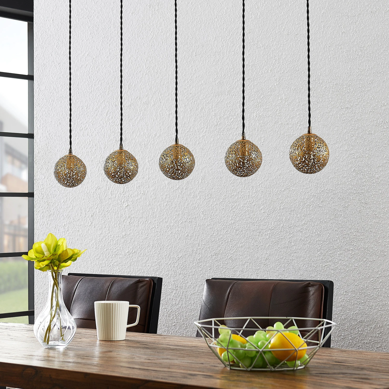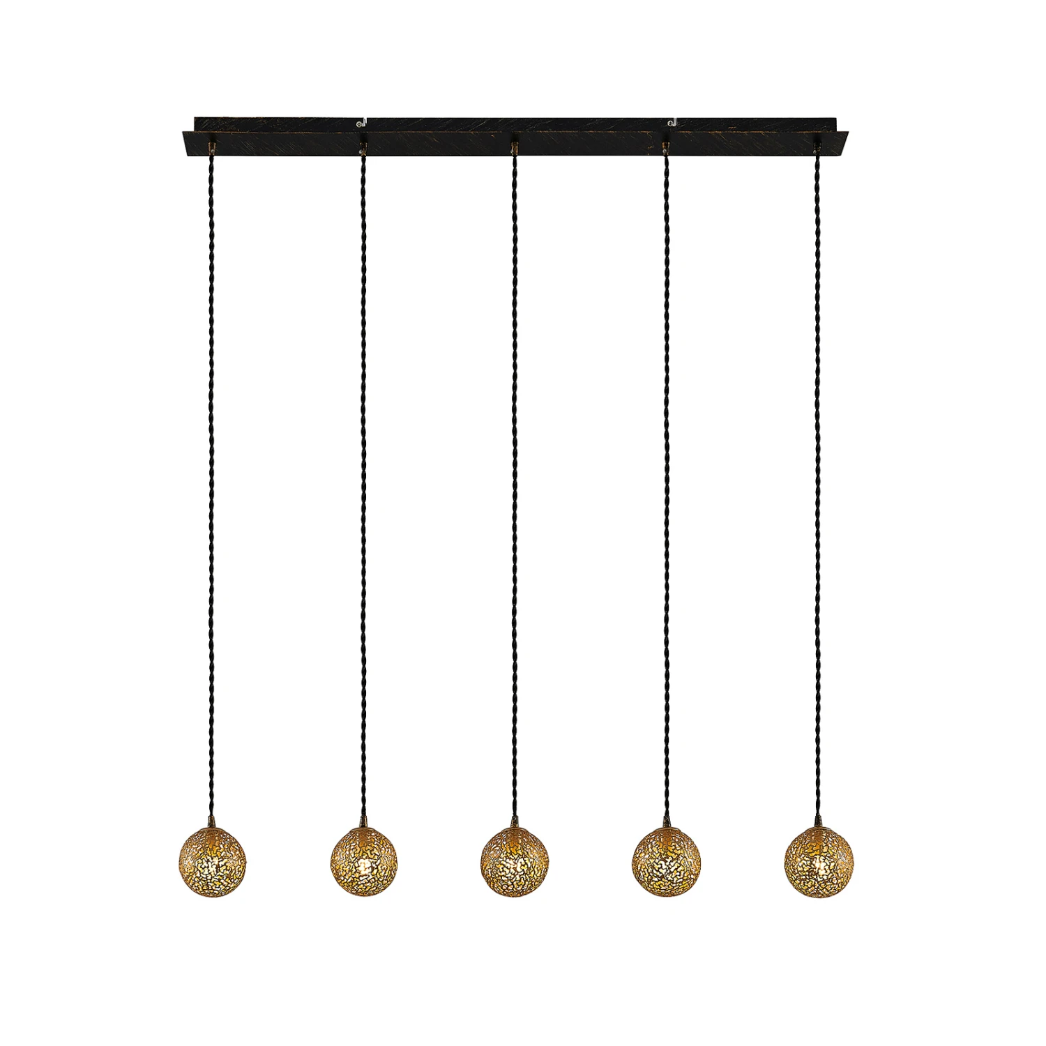 Perfekt für einen länglichen Tisch eignet sich die moderne Hängeleuchte Zale. Sie zeichnet sich durch ihre fünf Lampenschirme aus. Diese sind einzeln abgehängt, um das Licht bestmöglich im Raum zu verteilen. Sie bestehen aus goldfarbenem Metall und verfügen über ein filigranes Muster. Dank des Musters wird eine besonders wohnliche Atmosphäre geschaffen, denn das Licht dringt durch die Aussparungen und kreiert wundervolle Schattenspiele. Insgesamt überzeugt die Leuchte mit ihren Metallkugeln durch einen orientalischen Look.