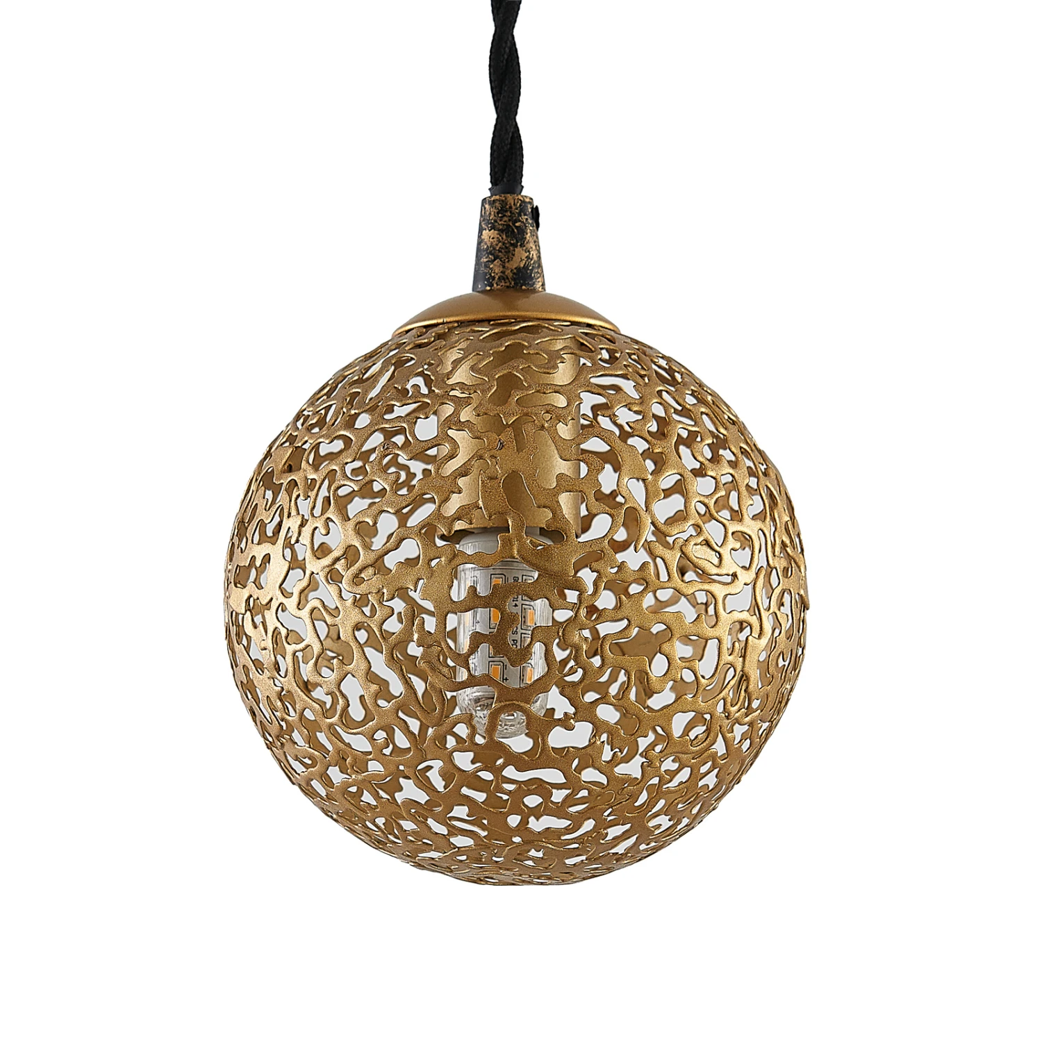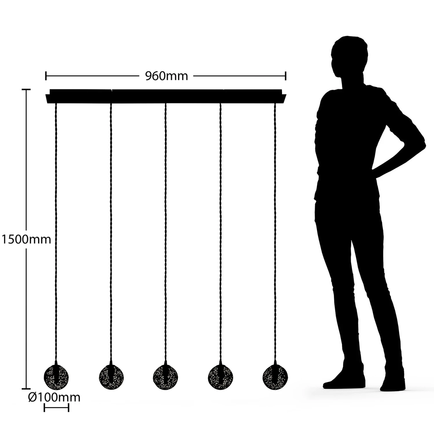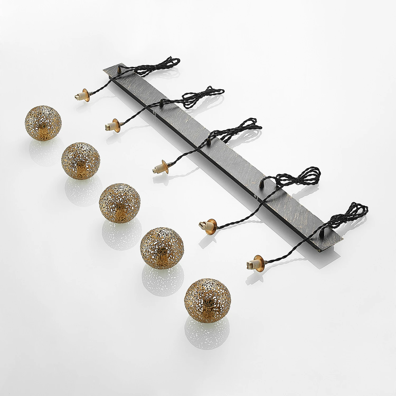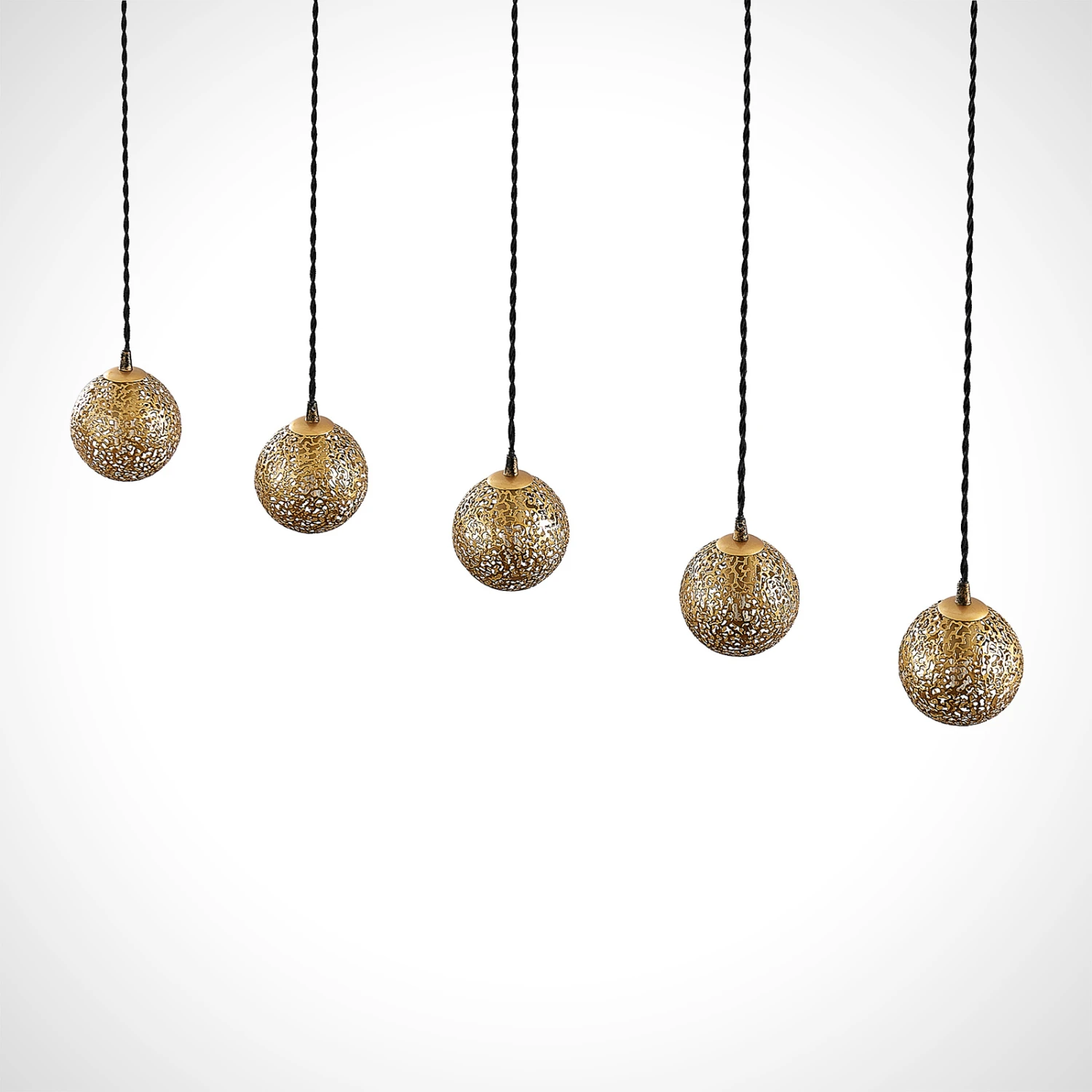 Perfekt für einen länglichen Tisch eignet sich die moderne Hängeleuchte Zale. Sie zeichnet sich durch ihre fünf Lampenschirme aus. Diese sind einzeln abgehängt, um das Licht bestmöglich im Raum zu verteilen. Sie bestehen aus goldfarbenem Metall und verfügen über ein filigranes Muster. Dank des Musters wird eine besonders wohnliche Atmosphäre geschaffen, denn das Licht dringt durch die Aussparungen und kreiert wundervolle Schattenspiele. Insgesamt überzeugt die Leuchte mit ihren Metallkugeln durch einen orientalischen Look.